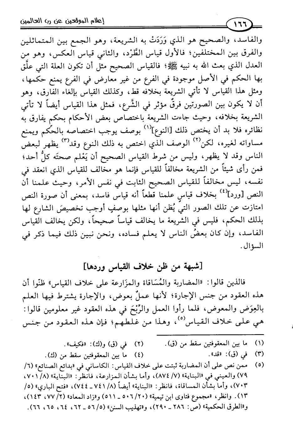والفاسد، والصحيح هو الذي وَرَدَتْ به الشريعة، وهو الجمع بين المتماثلين والفرق بين المختلفين، فالأول قياس الطَّرْد، والثاني قياس العكس، وهو من العدل الذي بعث اللَّه به نبيه -صلى اللَّه عليه وسلم-؛ فالقياس الصحيح مثل أن تكون العلة التي علَّق بها الحكم في الأصل موجودة في الفرع من غير معارض في الفرع يمنع حكمها، ومثل هذا القياس لا تأتي الشريعة بخلافه قط، وكذلك القياس بإلغاء الفارق، وهو أن لا يكون بين الصورتين فرقٌ مؤثر في الشَّرع، فمثل هذا القياس أيضًا لا تأتي الشريعة بخلافه، وحيث جاءت الشريعة باختصاص بعض الأحكام بحكمٍ يفارق به نظائره فلابد أن يختص ذلك [النوع] (١) بوصف يوجب اختصاصه بالحكم ويمنع مساواته لغيره، لكن (٢) الوصف الذي اختص به ذلك النوع وقد (٣) يظهر لبعض الناس وقد لا يظهر، وليس من شرط القياس الصحيح أن يَعْلم صحتَه كلُّ أحد، فمن رأى شيئًا من الشريعة مخالفًا للقياس فإنما هو مخالف للقياس الذي انعقد في نفسه، ليس مخالفًا للقياس الصحيح الثابت في نفس الأمر، وحيث علمنا أن النص [ورد] (٤) بخلاف قياس علمنا قطعًا أنه قياس فاسد، بمعنى أن سورة النص امتازت عن تلك الصور التي يُظن أنها مثلها بوصفٍ أوجب تخصيصَ الشارع لها بذلك الحكم، فليس في الشريعة ما يخالف قياسًا صحيحًا، ولكن يخالف القياس الفاسد، وإن كان بعضُ الناس لا يعلم فساده، ونحن نبين ذلك فيما ذكر في السؤال.