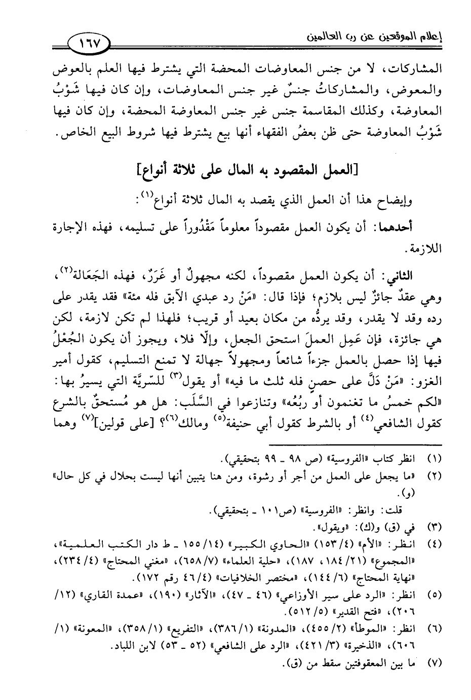 المشاركات، لا من جنس المعاوضات المحضة التي يشترط فيها العلم بالعوض والمعوض، والمشاركاتُ جنسٌ غير جنس المعاوضات، وإن كان فيها شَوْبُ المعاوضة، وكذلك المقاسمة جنس غير جنس المعاوضة المحضة، وإن كان فيها شَوْبُ المعاوضة حتى ظن بعضُ الفقهاء أنها بيع يشترط فيها شروط البيع الخاص.