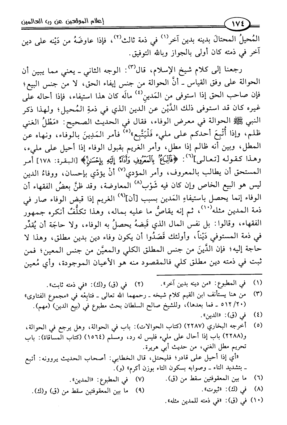 رجعنا إلى كلام شيخ الإسلام، قال (٣): الوجه الثاني -يعني مما يبين أن الحوالة على وفق القياس- أنَّ الحوالة من جنس إيفاء الحق، لا من جنس البيع، فإن صاحب الحق إذا استوفى من المَدينِ (٤) مالَه كان هذا استيفاء، فإذا أحاله على غيره كان قد استوفى ذلك الدَّيْن عن الدين الذي في ذمةِ المُحيل؛ ولهذا ذكر النبي -صلى اللَّه عليه وسلم- الحوالة في معرض الوفاء، فقال في الحديث الصحيح: "مَطْلُ الغني ظلم، وإذا أُتْبعَ أحدكم على مليء فَلْيَتَّبع" (٥) فأمر المَدِينَ بالوفاء، ونهاه عن المطل، وبين أنه ظالم إذا مطل، وأمر الغريم بقبول الوفاء إذا أحيل على مليء، وهذا كقوله [تعالى] (٦): {فَاتِّبَاعٌ بِالْمَعْرُوفِ وَأَدَاءٌ إِلَيْهِ بِإِحْسَانٍ} [البقرة: ١٧٨] أمر المستحق أن يطالب بالمعروف، وأمر المؤدي (٧) أنْ يؤدّي بإحسان، ووفاءُ الدين ليس هو البيع الخاص وإن كان فيه شَوْب (٨) المعاوضة، وقد ظنَّ بعضُ الفقهاء أن الوفاء إنما يحصل باستيفاءِ المَدين بسبب [أن] (٩) الغريم إذا قبض الوفاء صار في ذمة المدين مثله (١٠)، ثم إنه يقاصُّ ما عليه بماله، وهذا تكلُّفٌ أنكره جمهور الفقهاء، وقالوا: بل نفس المال الذي قَبضهُ يحصلُ به الوفاء، ولا حاجَة أن يُقدِّر في ذمة المستوفي دَيْنًا، وأولئك قَصَدُوا أن يكون وفاء دين بدين مطلق، وهذا لا حاجة إليه، فإن الدَّينَ من جنس المطلق الكلي والمعيَّن من جنس المعين، فمن ثبت في ذمته دين مطلق كلي فالمقصود منه هو الأعيان الموجودة، وأي مُعين