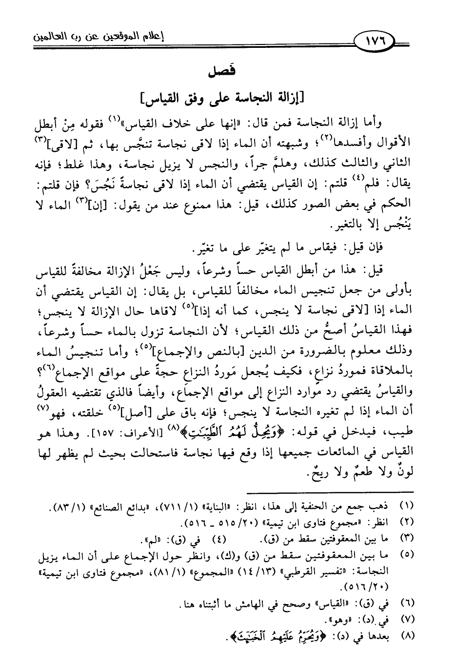 قيل: هذا من أبطل القياس حسًا وشرعًا، وليس جَعْلُ الإزالة مخالفةً للقياس بأولى من جعل تنجيس الماء مخالفًا للقياس، بل يقال: إن القياس يقتضي أن الماء إذا [لاقى نجاسة لا ينجس، كما أنه إذا] (٥) لاقاها حال الإزالة لا ينجس؛ فهذا القياسُ أصحُّ من ذلك القياس؛ لأن النجاسة تزول بالماء حسًا وشرعًا، وذلك معلوم بالضرورة من الدين [بالنص والإجماع] (٥)؛ وأما تنجيسُ الماء بالملاقاة فموردُ نزاعٍ، فكيف يُجعل مَوردُ النزاعِ حجةً على مواقع الإجماع (٦)؟ والقياسُ يقتضي رد موارد النزاع إلى مواقع الإجماع، وأيضًا فالذي تقتضيه العقولُ أن الماء إذا لم تغيره النجاسة لا ينجس، فإنه باق على [أصل] (٥) خلقته، فهو (٧) طيب، فيدخل في قوله: {وَيُحِلُّ لَهُمُ الطَّيِّبَاتِ} (٨) [الأعراف: ١٥٧]. وهذا هو القياس في المائعات جميعها إذا وقع فيها نجاسة فاستحالت بحيث لم يظهر لها لونٌ ولا طعمٌ ولا ريحٌ.