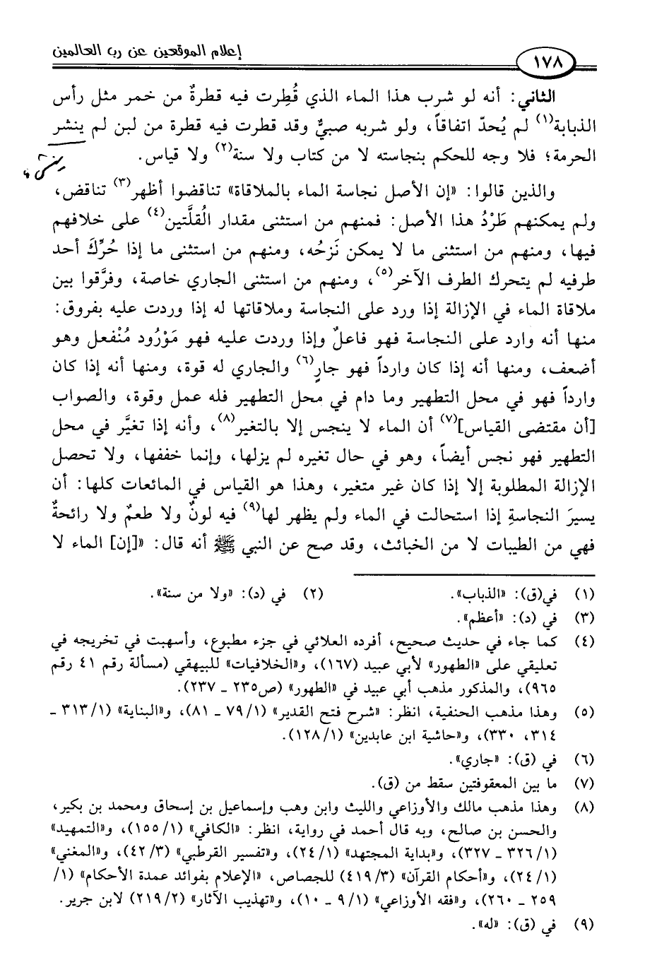 والذين قالوا: "إن الأصل نجاسة الماء بالملاقاة" تناقضوا أظهر (٣) تناقض، ولم يمكنهم طَرْدُ هذا الأصل: فمنهم من استثنى مقدار الُقلَّتين (٤) على خلافهم فيها، ومنهم من استثنى ما لا يمكن نَزحُه، ومنهم من استثنى ما إذا حُرِّكَ أحد طرفيه لم يتحرك الطرف الآخر (٥)، ومنهم من استثنى الجاري خاصة، وفرَّقوا بين ملاقاة الماء في الإزالة إذا ورد على النجاسة وملاقاتها له إذا وردت عليه بفروق: منها أنه وارد على النجاسة فهو فاعلٌ وإذا وردت عليه فهو مَوْرُود مُنْفعل وهو أضعف، ومنها أنه إذا كان واردًا فهو جارٍ (٦) والجاري له قوة، ومنها أنه إذا كان واردًا فهو في محل التطهير وما دام في محل التطهير فله عمل وقوة، والصواب [أن مقتضى القياس] (٧) أن الماء لا ينجس إلا بالتغير (٨)، وأنه إذا تغيَّر في محل التطهير فهو نجس أيضًا، وهو في حال تغيره لم يزلها، وإنما خففها، ولا تحصل الإزالة المطلوبة إلا إذا كان غير متغير، وهذا هو القياس في المائعات كلها: أن يسيرَ النجاسةِ إذا استحالت في الماء ولم يظهر لها (٩) فيه لونٌ ولا طعمٌ ولا رائحةٌ فهي من الطيبات لا من الخبائث، وقد صح عن النبي -صلى اللَّه عليه وسلم- أنه قال: " [إن] الماء لا