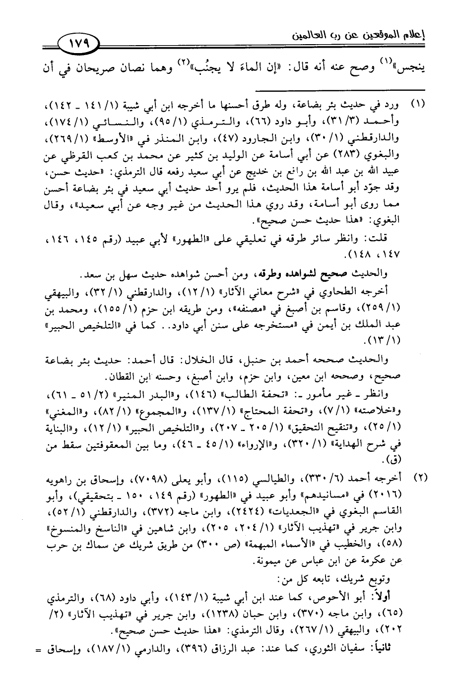 (١) ورد في حديث بئر بضاعة، وله طرق أحسنها ما أخرجه ابن أبي شيبة (١/ ١٤١ - ١٤٢)، وأحمد (٣/ ٣١)، وأبو داود (٦٦)، والترمذي (١/ ٩٥)، والنسائي (١/ ١٧٤)، والدارقطني (١/ ٣٠)، وابن الجارود (٤٧)، وابن المنذر في "الأوسط" (١/ ٢٦٩)، والبغوي (٢٨٣) عن أبي أسامة عن الوليد بن كثير عن محمد بن كعب القرظي عن عبيد اللَّه بن عبد اللَّه بن رافع بن خديج عن أبي سعيد رفعه قال الترمذي: "حديث حسن، وقد جوّد أبو أسامة هذا الحديث، فلم يرو أحد حديث أبي سعيد في بئر بضاعة أحسن مما روى أبو أسامة، وقد روي هذا الحديث من غير وجه عن أبي سعيد"، وقال البغوي: "هذا حديث حسن صحيح".