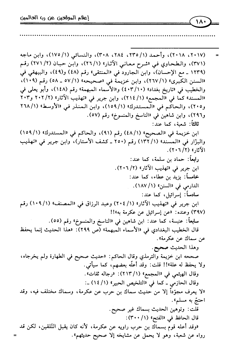 "وقد أعله قوم بسماك بن حرب راويه عن عكرمة؛ لأنه كان يقبل التّلقين، لكن قد رواه عن شعبة، وهو لا يحمل عن مشايخه إلا صحيح حديثهم". =