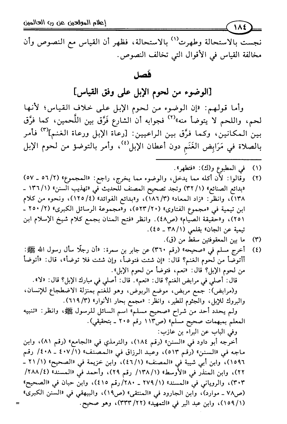 وأما قولهم: "إن الوضوء من لحوم الإبل على خلاف القياس؛ لأنها لحم، واللحم لا يتوضأ منه" (٢) فجوابه أن الشارع فَرَّق بين اللَّحمين، كما فرَّق بين المكانين، وكما فرَّق بين الراعيين: [رعاة الإبل ورعاة الغنم] (٣) فأمر بالصلاة في مَرَابِض الغَنَمِ دون أعطان الإبل (٤)، وأمر بالتوضؤ من لحوم الإبل