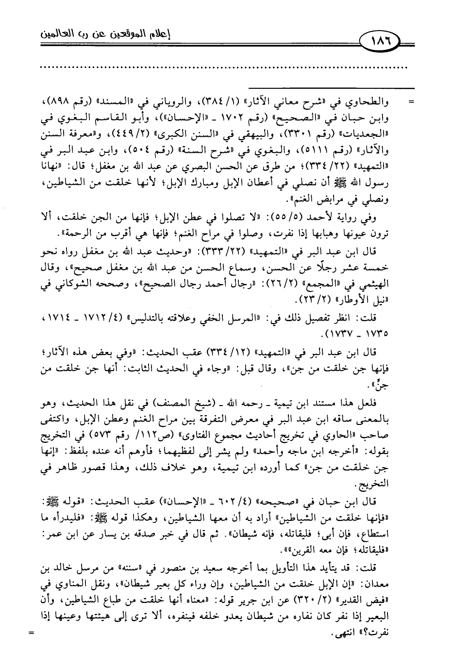 فلعل هذا مستند ابن تيمية -رحمه اللَّه- (شيخ المصنف) في نقل هذا الحديث، وهو بالمعنى ساقه ابن عبد البر في معرض التفرقة بين مراح الغنم وعطن الإبل، واكتفى صاحب "الحاوي في تخريج أحاديث مجموع الفتاوى" (ص ١١٢/ رقم ٥٧٣) في التخريج بقوله: "أخرجه ابن ماجه وأحمد" ولم يشر إلى لفظيهما، فأوهم أنه عنده بلفظ: "إنها جن خلقت من جن" كما أورده ابن تيمية، وهو خلاف ذلك، وهذا قصور ظاهر في التخريج.