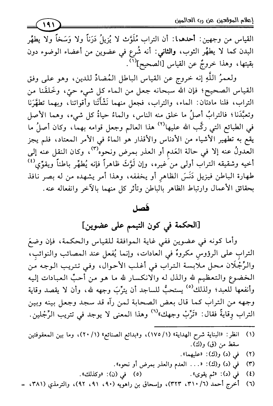 ولعمرُ اللَّهِ إنه خروج عن القياس الباطل المُضادِّ للدين، وهو على وفق القياس الصحيح؛ فإن اللَّه سبحانه جعل من الماء كل شيء حيّ، وخَلقَنا من التراب، فلنا مادتان: الماء، والتراب، فجعل منهما نَشْأَتَنا وأقواتنا، وبهما تطهَّرَتا وتعبَّدَنا، فالترابُ أصلُ ما خلق منه الناس، والماءُ حياةُ كل شيء، وهما الأصل في الطبائع التي ركَّب اللَّه عليها (٢) هذا العالم وجعل قوامه بهما، وكان أصلُ ما يقع به تطهير الأشياء من الأدناس والأقذار هو الماءُ في الأمر المعتاد، فلم يجز العدولُ عنه إلا في حالة العَدمِ أو العذر بمرض ونحوه (٣)، وكان النقل عنه إلى أخيه وشقيقه التراب أولى من غيره، وإن لَوَّثَ ظاهرًا فإنه يُطهِّر باطنًا ويقوِّي (٤) طهارة الباطن فيزيل دَنَسَ الظاهرِ أو يخففه، وهذا أمر يشهده من له بصر نافذ بحقائق الأعمال وارتباط الظاهر بالباطن وتأثر كل منهما بالآخر وانفعاله عنه.