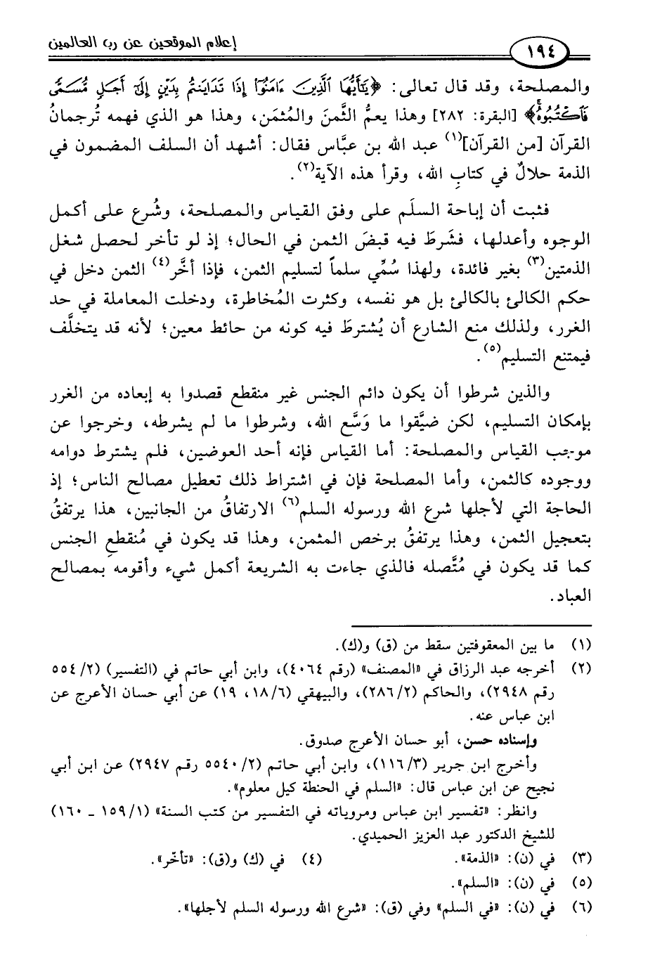 والمصلحة، وقد قال تعالى: {يَاأَيُّهَا الَّذِينَ آمَنُوا إِذَا تَدَايَنْتُمْ بِدَيْنٍ إِلَى أَجَلٍ مُسَمًّى فَاكْتُبُوهُ} [البقرة: ٢٨٢]، وهذا يعمَّ الثَّمنَ والمُثمَن، وهذا هو الذي فهمه تُرجمانُ القرآن [من القرآن] (١) عبد اللَّه بن عبَّاس فقال: أشهد أن السلف المضمون في الذمة حلالٌ في كتابِ اللَّه، وقرأ هذه الآية (٢).