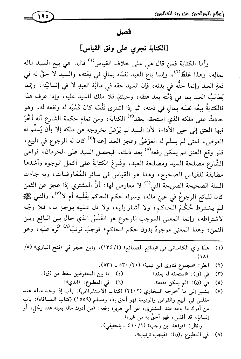 وأما الكتابة فمن قال هي على خلاف القياس (١) قال: هي بيع السيد ماله بمالِه، وهذا غلطٌ (٢)، وإنما باع العبد نفسَه بمالٍ في ذِمّته، والسيد لا حقَّ له في ذمةِ العبد وإنما حقُّه في بدنه، فإن السيد حقه في ماليَّة العبدِ لا في إنسانيّته، وإنما يُطالبُ العبد بما في ذِمَّته بعد عتقه، وحينئذٍ فلا ملك للسيد عليه، وإذا عرف هذا فالكتابةُ بيعُه نفسَه بمالٍ في ذمته، ثم إذا اشترى نَفْسَه كان كَسْبُه له ونفعه له، وهو حادثٌ على ملكه الذي استحقه بعقد (٣) الكتابة، ومن تمام حكمة الشارع أنه أخَّرَ فيها العتق إلى حين الأداء؛ لأن السيد لم يَرْضَ بخروجه عن ملكه إلا بأن يُسلِّم له العوض، فمتى لم يسلم له العوَضُ وعجز العبد [عنه] (٤) كان له الرجوع في البيع، فلو وقع العتق لم يمكن رفعه (٥) بعد ذلك، فيحصل السيد على الحرمان، فراعى الشَّارع مصلحة السيد ومصلحة العبد، وشَرعَ الكتابةَ على أكمل الوجوه وأشدها مطابقة للقياس الصحيح، وهذا هو القياس في سائر المُعَاوضات، وبه جاءت السنة الصحيحة الصريحة التي (٦) لا معارض لها: أنَّ المشتري إذا عجز عن الثمن كان للبائع الرجوعُ في عينِ ماله، وسواء حكم الحاكم بفَلَسِه أم لا (٧)، والنبي -صلى اللَّه عليه وسلم- لم يشترط حُكْمَ الحاكم، ولا أشار إليه، ولا دل عليه بوجهٍ ما، فلا وجْه لاشتراطه، وإنما المعنى الموجب للرجوع هو الفَلَسُ الذي حال بين البائع وبين الثمن، وهذا المعنى موجودٌ بدون حكم الحاكم، فوجبَ ترتبُ (٨) أثَرِه عليه، وهو