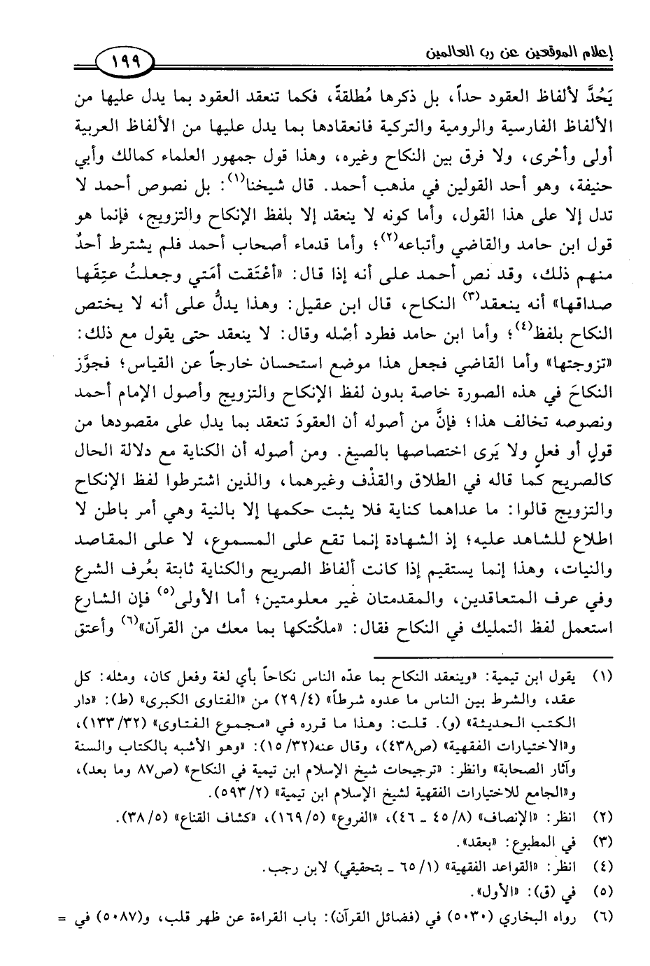(١) يقول ابن تيمية: "وينعقد النكاح بما عدّه الناس نكاحًا بأي لغة وفعل كان، ومثله: كل عقد، والشرط بين الناس ما عدوه شرطًا" (٤/ ٢٩) من "الفتاوى الكبرى" (ط): "دار الكتب الحديثة" (و). قلت: وهذا ما قرره في "مجموع الفتاوى" (٣٢/ ١٣٣)، و"الاختيارات الفقهية" (ص ٤٣٨)، وقال عنه (٣٢/ ١٥): "وهو الأشبه بالكتاب والسنة وآثار الصحابة" وانظر: "ترجيحات شيخ الإسلام ابن تيمية في النكاح" (ص ٨٧ وما بعد)، و"الجامع للاختيارات الفقهية لشيخ الإسلام ابن تيمية" (٢/ ٥٩٣).
