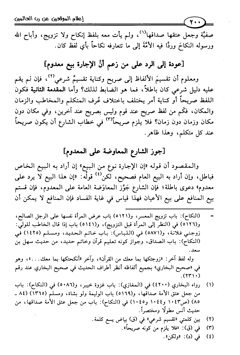 والمقصود أن قوله "إن الإجارة نوع من البيع" إن أراد به البيع الخاص فباطل، وإن أراد به البيع العام فصحيح، لكن (٤) قولُه: "إن هذا البيع لا يرد على معدوم" دعوى باطلة؛ فإن الشارع جَوَّز المعاوَضة العامة على المعدوم، فإن قستم بيع المنافع على بيع الأعيان فهذا قياس في غاية الفساد فإن المنافع لا يمكن أن