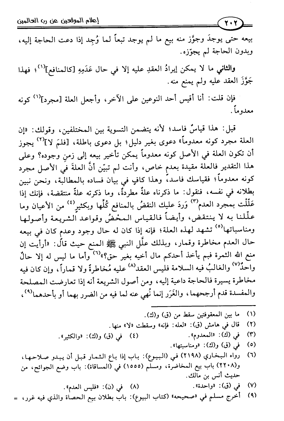 قيل: هذا قياسٌ فاسد؛ لأنه يتضمن التسوية بين المختلفين، وقولك: "إن العلة مجرد كونه معدومًا" دعوى بغير دليل، بل دعوى باطلة، [فلمَ لا] (٢) يجوز أن تكون العلة في الأصل كونه معدومًا يمكن تأخير بيعه إلى زمنِ وجوده؟ وعلى هذا التقدير فالعلة مقيدة بعدمٍ خاص، وأنت لم تبيّن أنَّ العلةَ في الأصل مجرد كونه معدومًا، فقياسك فاسد، وهذا كافٍ في بيان فساده بالمطالبة، ونحن نبين بطلانه في نفسه، فنقول: ما ذكرناه علةٌ مطردةٌ، وما ذكرته علةً منتقضة، فإنك إذا عَلّلْت بمجرد العدم (٣) وَردَ عليك النقضُ بالمنافع كُلِّها وبكثيرٍ (٤) من الأعيان وما علّلنا به لا ينتقض، وأيضًا فالقياس المحْضُ وقواعد الشريعة وأصولها ومناسباتها (٥) تشهد لهذه العلة، فإنه إذا كان له حال وجود وعدمٍ كان في بيعه حال العدم مخاطرة وقمار، وبذلك علَّل النبي -صلى اللَّه عليه وسلم- المنع حيث قال: "أرأيت إن منع اللَّه الثمرة فبم يأخذ أحدكم مال أخيه بغير حق؟ " (٦) وأما ما ليس له إلا حالٌ واحدٌ (٧) والغالبُ فيه السلامة فليس العقد (٨) عليه مُخاطرةً ولا قمارًا، وإن كان فيه مخاطرة يسيرة فالحاجة داعية إليه، ومن أصول الشريعة أنه إذا تعارضت المصلحة والمفسدة قدم أرجحهما، والغَرَر إنما نُهي عنه لما فيه من الضرر بهما أو بأحدهما (٩)،