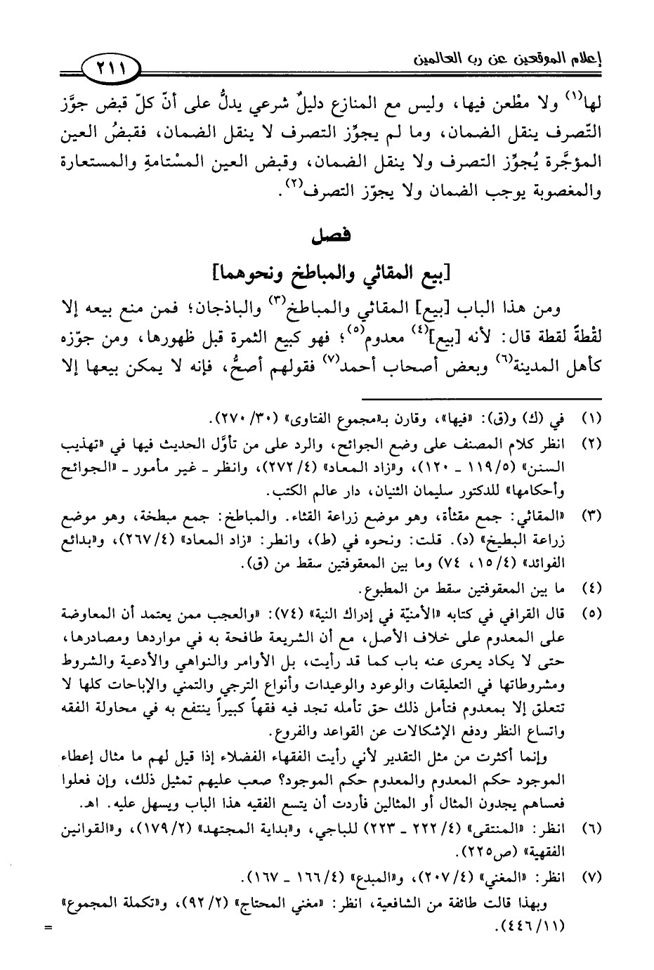 (٣) "المقاثي: جمع مقثأة، وهو موضع زراعة القثاء. والمباطخ: جمع مبطخة، وهو موضع زراعة البطيخ" (د). قلت: ونحوه في (ط)، وانطر: "زاد المعاد" (٤/ ٢٦٧)، و"بدائع الفوائد" (٤/ ١٥، ٧٤) وما بين المعقوفتين سقط من (ق).