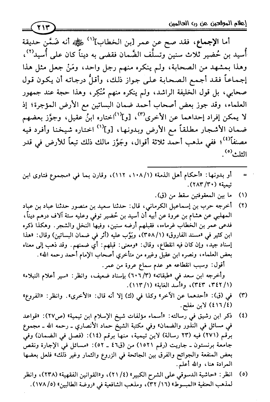 (٢) أخرجه حرب بن إسماعيل الكرماني، قال: حدثنا سعيد بن منصور حدثنا عباد بن عباد المهلبي عن هشام بن عروة عن أبيه أن أسيد بن حُضير توفي وعليه ستة آلاف درهم دينًا، فدعى عمر بن الخطاب غرماءه، فقبلهم أرضه سنين، وفيها النخل والشجر. وهكذا ذكره ابن كثير في "مسند الفاروق" (١/ ٣٥٨)، وبَوَّب عليه (أثر في ضمان البساتين) وقال: "هذا إسناد جيد، وإن كان فيه انقطاع، وقال: "ومعنى: قبلهم: أي ضمنهم. وقد ذهب إلى معناه بعض العلماء، ونصره ابن عقيل وغيره من متأخري أصحاب الإمام أحمد رحمه اللَّه".