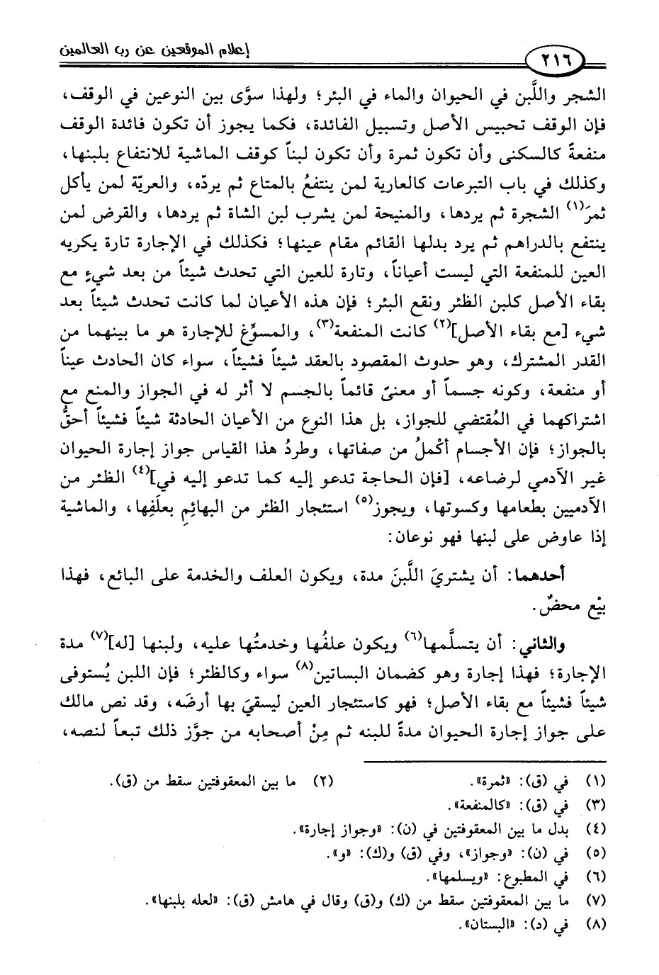 والثاني: أن يتسلَّمها (٦) ويكون علفُها وخدمتُها عليه، ولبنها [له] (٧) مدة الإجارة؛ فهذا إجارة وهو كضمان البساتين (٨) سواء وكالظئر؛ فإن اللبن يُستوفى شيئًا فشيئًا مع بقاء الأصل؛ فهو كاستئجار العين ليسقيَ بها أرضَه، وقد نص مالك على جواز إجارة الحيوان مدةً للبنه ثم مِنْ أصحابه من جوَّز ذلك تبعًا لنصه،