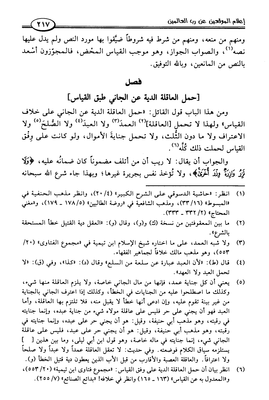 (٦) انظر بيان أن حمل العاقلة الدية على وفق القياس: "مجموع فتاوى ابن تيمية" (٢٠/ ٥٥٣)، و"المعدول به عن القياس" (١٦٣ - ١٦٥) وانظر في خلافه! "بدائع الصنائع" (٧/ ٢٥٥).