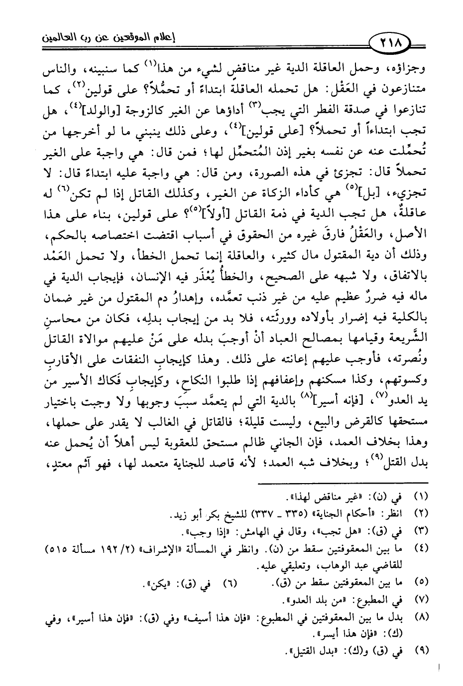 وجزاؤه، وحمل العاقلة الدية غير مناقضٍ لشيء من هذا (١) كما سنبينه، والناس متنازعون في العَقْل: هل تحمله العاقلة ابتداءً أو تحمُّلًا؟ على قولين (٢)، كما تنازعوا في صدقة الفطر التي يجب (٣) أداؤها عن الغير كالزوجة [والولد] (٤)، هل تجب ابتداءًا أو تحملًا؟ [على قولين] (٤)، وعلى ذلك ينبني ما لو أخرجها من تُحمِّلت عنه عن نفسه بغير إذن المُتحمِّل لها؛ فمن قال: هي واجبة على الغير تحملًا قال: تجزئ في هذه الصورة، ومن قال: هي واجبة عليه ابتداءً قال: لا تجزيء، [بل] (٥) هي كأداء الزكاة عن الغير، وكذلك القاتل إذا لم تكن (٦) له عاقلةٌ، هل تجب الدية في ذمة القاتل [أولًا] (٥)؛ على قولين، بناء على هذا الأصل، والعَقْلُ فارقَ غيره من الحقوق في أسباب اقتضت اختصاصه بالحكم، وذلك أن دية المقتول مال كثير، والعاقلة إنما تحمل الخطأ، ولا تحمل العَمْد بالاتفاق، ولا شبهه على الصحيح، والخطأُ يُعْذَر فيه الإنسان، فإيجاب الدية في ماله فيه ضررٌ عظيم عليه من غير ذنب تعمَّده، وإهدارُ دم المقتول من غير ضمان بالكلية فيه إضرار بأولاده وورثَته، فلا بد من إيجاب بدلِه، فكان من محاسنِ الشَّريعة وقيامها بمصالح العباد أنْ أوجبَ بدله على مَنْ عليهم موالاة القاتل ونُصرته، فأوجب عليهم إعانته على ذلك. وهذا كإيجابِ النفقات على الأقاربِ وكسوتهم، وكذا مسكنهم وإعفافهم إذا طلبوا النكاحِ، وكإيجابِ فَكاك الأسير من يد العدو (٧)، [فإنه أسير] (٨) بالدية التي لم يتعمَّد سبَبَ وجوبها ولا وجبت باختيار مستحقها كالقرض والبيع، وليست قليلة؛ فالقاتل في الغالب لا يقدر على حملها، وهذا بخلاف العمد، فإن الجاني ظالم مستحق للعقوبة ليس أهلًا أن يُحمل عنه بدل القتل (٩)؛ وبخلاف شبه العمد؛ لأنه قاصد للجناية متعمد لها، فهو آثم معتدٍ،