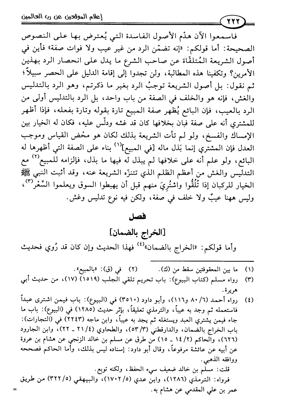 فاسمعوا الآن هدْم الأصول الفاسدة التي يُعترض بها على النصوص الصحيحة: أما قولكم: "إنه تضمّن الرد من غير عيب ولا فوات صفة" فأين في أصول الشريعة المُتلقّاة عن صاحب الشرع ما يدل على انحصار الرد بهذين الأمرين؟ وتكفينا هذه المطالبة، ولن تجدوا إلى إقامة الدليل على الحصر سبيلًا؛ ثم نقول: بل أصول الشريعة توجبُ الرد بغير ما ذكرتم، وهو الرد بالتدليس والغش، فإنه هو والخلف في الصفة من باب واحد، بل الرد بالتدليس أولى من الرد بالعيب، فإن البائع يُظهر صفة المبيع تارة بقوله وتارة بفعله، فإذا أظهر للمشتري أنه على صفة فبان بخلافها كان قد غشه ودلّس عليه، فكان له الخيار بين الإمساك والفسخ، ولو لم تأت الشريعة بذلك لكان هو محْض القياس وموجب العدل فإن المشتري إنما بَذل ماله [في المبيع] (١) بناء على الصفة التي أظهرها له البائع، ولو علم أنه على خلافها لم يبذل له فيها ما بذل، فإلزامه للمبيع (٢) مع التدليس والغش من أعظم الظلم الذي تتنزّه الشريعة عنه، وقد أثبت النبي -صلى اللَّه عليه وسلم- الخيار للركبان إذا تُلُقُّوا واشتُرِيَ منهم قبل أن يهبطوا السوق ويعلموا السِّعْر (٣)، وليس ههنا عيبٌ ولا خلف في صفة، ولكن فيه نوع تدليس وغش.