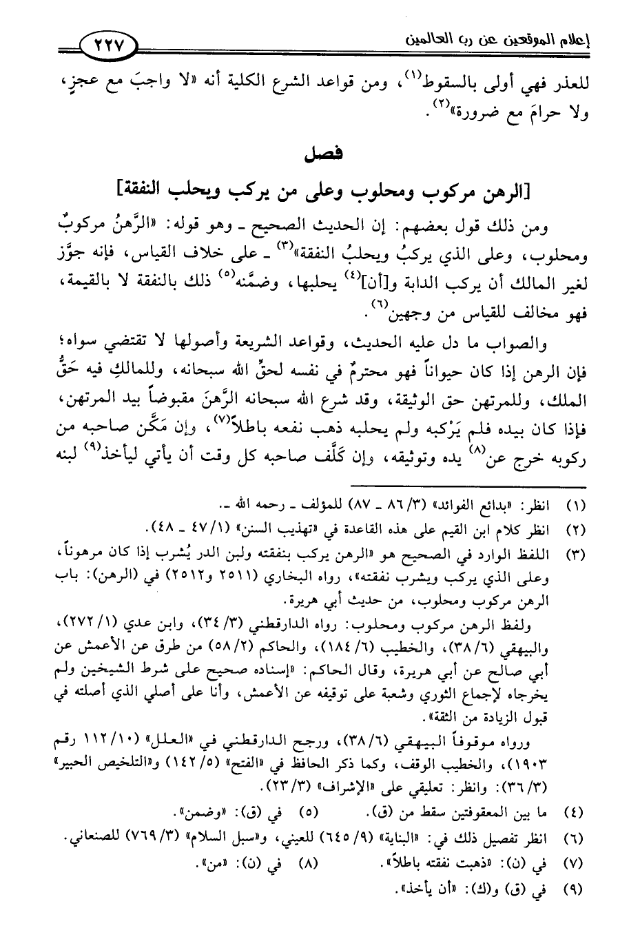 (٣) اللفظ الوارد في الصحيح هو "الرهن يركب بنفقته ولبن الدر يُشرب إذا كان مرهونًا، وعلى الذي يركب ويشرب نفقته"، رواه البخاري (٢٥١١ و ٢٥١٢) في (الرهن): باب الرهن مركوب ومحلوب، من حديث أبي هريرة.