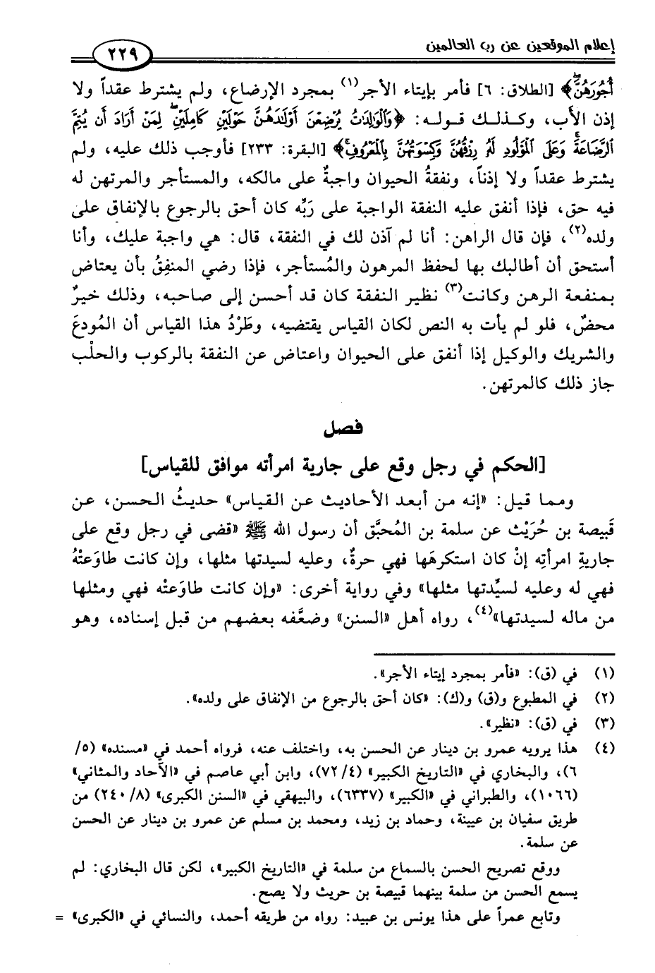أُجُورَهُنَّ} [الطلاق: ٦] فأمر بإيتاء الأجر (١) بمجرد الإرضاع، ولم يشترط عقدًا ولا إذن الأَب، وكذلك قوله: {وَالْوَالِدَاتُ يُرْضِعْنَ أَوْلَادَهُنَّ حَوْلَيْنِ كَامِلَيْنِ لِمَنْ أَرَادَ أَنْ يُتِمَّ الرَّضَاعَةَ وَعَلَى الْمَوْلُودِ لَهُ رِزْقُهُنَّ وَكِسْوَتُهُنَّ بِالْمَعْرُوفِ} [البقرة: ٢٣٣]، فأوجب ذلك عليه، ولم يشترط عقدًا ولا إذنًا، ونفقةُ الحيوان واجبةٌ على مالكه، والمستأجر والمرتهن له فيه حق، فإذا أنفق عليه النفقة الواجبة على رَبِّه كان أحق بالرجوع بالإنفاق على ولده (٢)، فإن قال الراهن: أنا لم آذن لك في النفقة، قال: هي واجبة عليك، وأنا أستحق أن أطالبك بها لحفظ المرهون والمُستأجر، فإذا رضي المنفِقُ بأن يعتاض بمنفعة الرهن وكانت (٣) نظير النفقة كان قد أحسن إلى صاحبه، وذلك خيرٌ محضٌ، فلو لم يأت به النص لكان القياس يقتضيه، وطَرْدُ هذا القياس أن المُودعَ والشريك والوكيل إذا أنفق على الحيوان واعتاض عن النفقة بالركوب والحلْب جاز ذلك كالمرتهن.