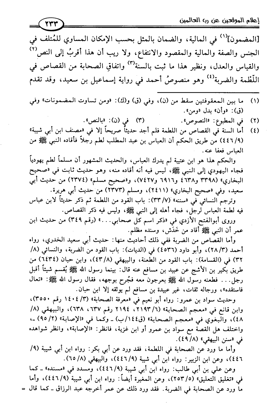 [المضمون] (١) في المالية، والضمان بالمثل بحسب الإمكان المساوي للمُتلف في الجنس والصفة والمالية والمقصود والانتفاع، ولا ريب أن هذا أقربُ إلى النص (٢) والقياس والعدل، ونظير هذا ما ثبت بالسنة (٣) واتفاقِ الصحابة من القصاص في اللّطْمة والضربة (٤) وهو منصوصُ أحمد في رواية إسماعيل بن سعيد، وقد تقدم