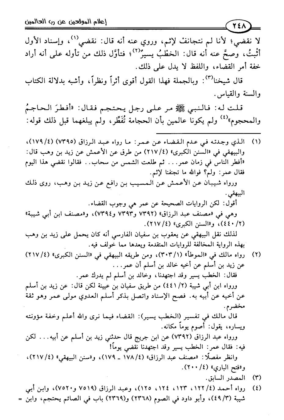 (١) الذي وجدته في عدم القضاء عن عمر: ما رواه عبد الرزاق (٧٣٩٥) (٤/ ١٧٩)، والبيهقي في "السنن الكبرى" (٤/ ٢١٧) من طرق عن الأعمش عن زيد بن وهب قال: "أفطر الناس في زمان عمر. . . ثم طلعت الشمس من سحاب. . فقالوا نقضي هذا اليوم فقال عمر: ولم؟ فواللَّه ما تجنفنا لإثم.
