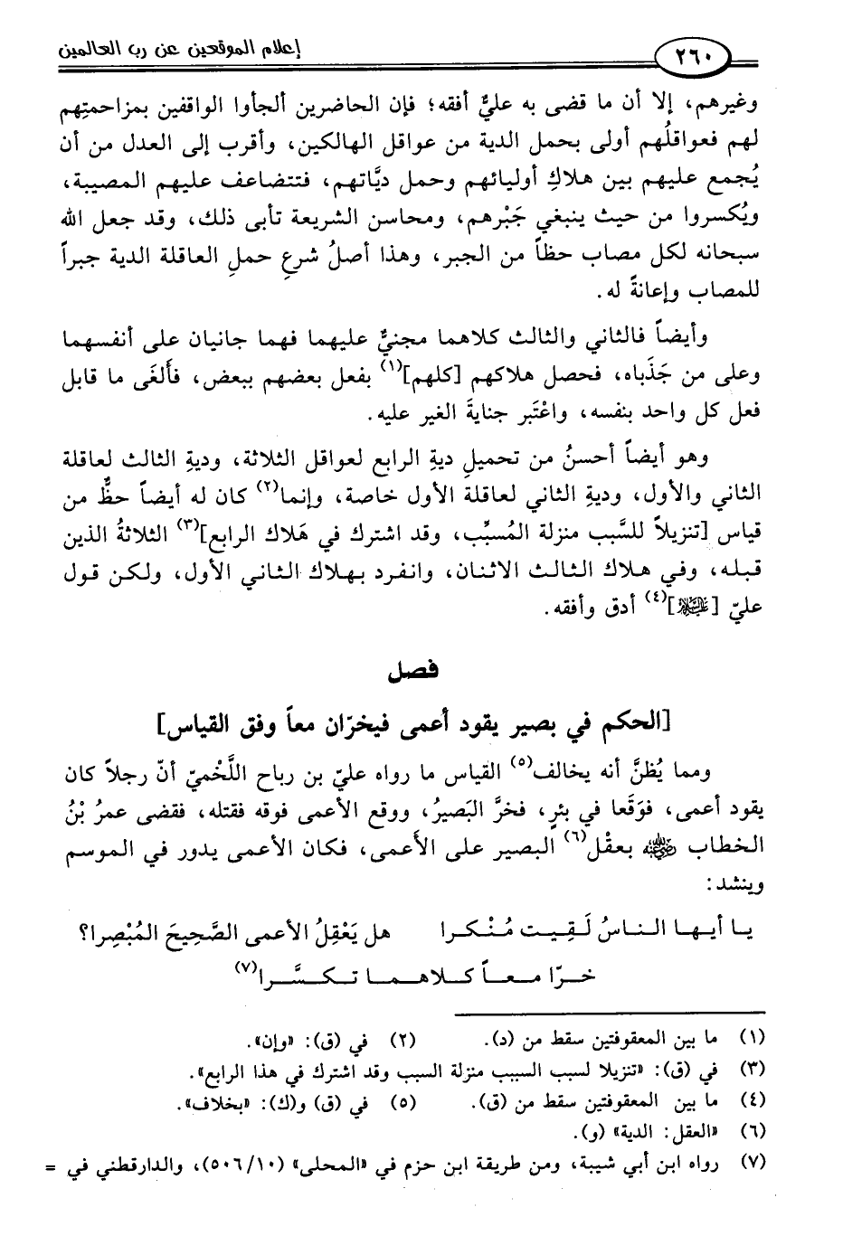 وغيرهم، إلا أن ما قضى به عليٌّ أفقه؛ فإن الحاضرين ألجأوا الواقفين بمزاحمتِهم لهم فعواقلُهم أولى يحمل الدية من عواقل الهالكين، وأقرب إلى العدل من أن يُجمع عليهم بين هلاكِ أوليائهم وحمل ديَّاتهم، فتتضاعف عليهم المصيبة، ويُكسروا من حيث ينبغي جَبْرهم، ومحاسن الشريعة تأبى ذلك، وقد جعل اللَّه سبحانه لكل مصاب حظًا من الجبر، وهذا أصلُ شرع حملِ العاقلة الدية جبرًا للمصاب وإعانةً له.