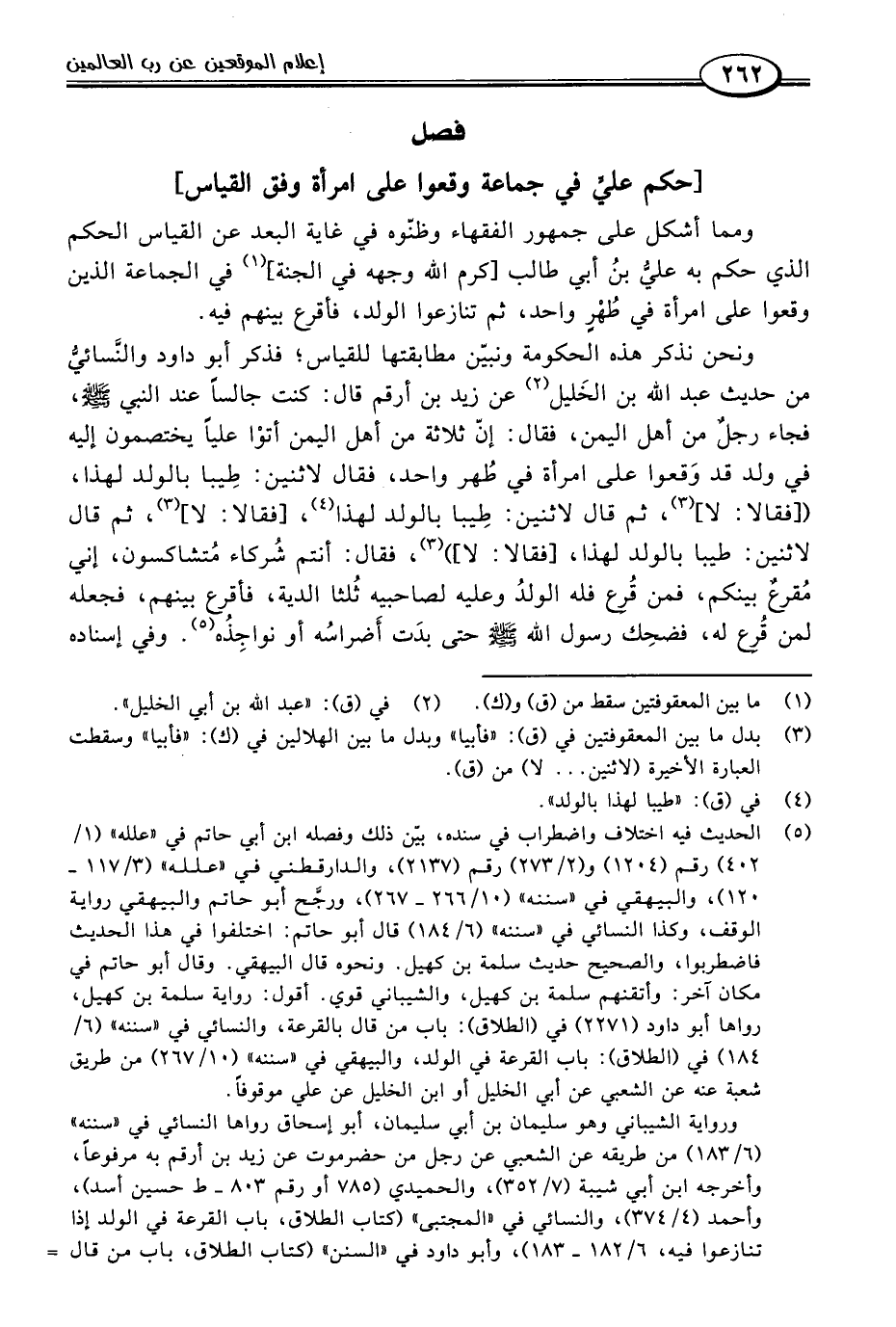 ونحن نذكر هذه الحكومة ونبيّن مطابقتها للقياس؛ فذكر أبو داود والنَّسائيُّ من حديث عبد اللَّه بن الخَليل (٢) عن زيد بن أرقم قال: كنت جالسًا عند النبي -صلى اللَّه عليه وسلم-، فجاء رجلٌ من أهل اليمن، فقال: إنّ ثلاثة من أهل اليمن أتوْا عليًا يختصمون إليه في ولد قد وَقعوا على امرأة في طُهر واحد، فقال لاثنين: طِيبا بالولد لهذا، ([فقالا: لا] (٣)، ثم قال لاثنين: طِيبا بالولد لهذا (٤)، [فقالا: لا] (٣)، ثم قال لاثنين: طيبا بالولد لهذا، [فقالا: لا]) (٣)، فقال: أنتم شُركاء مُتشاكسون، إني مُقرعٌ بينكم، فمن قُرِع فله الولدُ وعليه لصاحبيه ثُلثا الدية، فأقرع بينهم، فجعله لمن قُرع له، فضحِك رسول اللَّه -صلى اللَّه عليه وسلم- حتى بدَت أَضراسُه أو نواجِذُه (٥). وفي إسناده