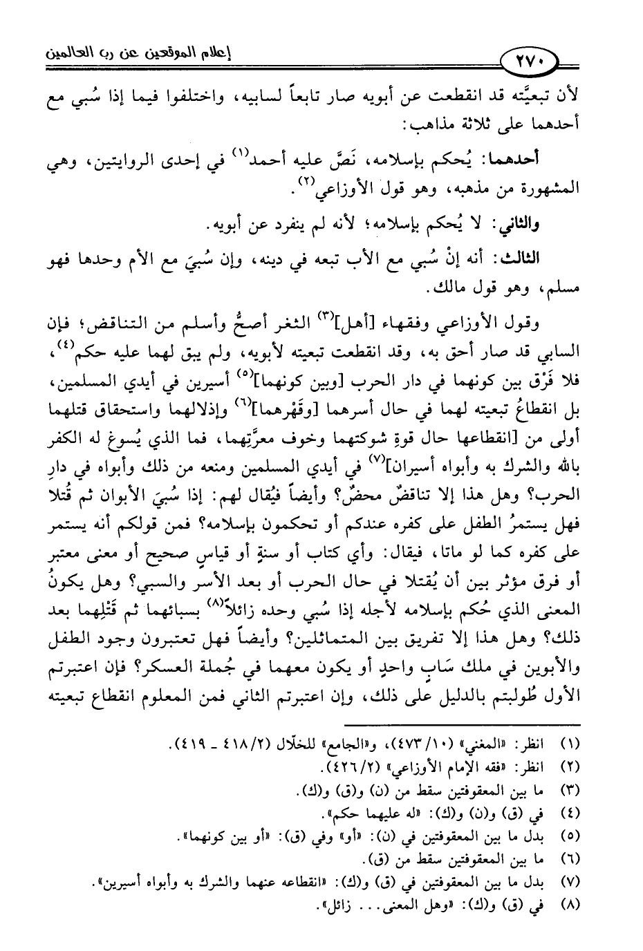 وقول الأوزاعي وفقهاء [أهل] (٣) الثغر أصحُّ وأسلم من التناقض؛ فإن السابي قد صار أحق به، وقد انقطعت تبعيته لأبويه، ولم يبق لهما عليه حكم (٤)، فلا فَرْق بين كونهما في دار الحرب [وبين كونهما] (٥) أسيرين في أيدي المسلمين، بل انقطاعُ تبعيته لهما في حال أسرهما [وقَهْرهما] (٦) وإذلالهما واستحقاق قتلهما أولى من [انقطاعها حال قوةِ شوكتهما وخوف معرَّتِهما، فما الذي يُسوغ له الكفر باللَّه والشرك به وأبواه أسيران] (٧) في أيدي المسلمين ومنعه من ذلك وأبواه في دارِ الحرب؟ وهل هذا إلا تناقضٌ محضٌ؟ وأيضًا فيُقال لهم: إذا سُبيَ الأبوان ثم قُتلا فهل يستمرُ الطفل على كفره عندكم أو تحكمون بإسلامه؟ فمن قولكم أنه يستمر على كفره كما لو ماتا، فيقال: وأي كتاب أو سنةٍ أو قياسٍ صحيح أو معنى معتبر أو فرق مؤثر بين أن يُقتلا في حال الحرب أو بعد الأسر والسبي؟ وهل يكونُ المعنى الذي حُكم بإسلامه لأجله إذا سُبي وحده زائلًا (٨) بسبائهما ثم قَتْلِهما بعد ذلك؟ وهل هذا إلا تفريق بين المتماثلين؟ وأيضًا فهل تعتبرون وجود الطفل والأبوين في ملك سَابٍ واحدٍ أو يكون معهما في جُملة العسكر؟ فإن اعتبرتم الأول طُولبتم بالدليل على ذلك، وإن اعتبرتم الثاني فمن المعلوم انقطاع تبعيته