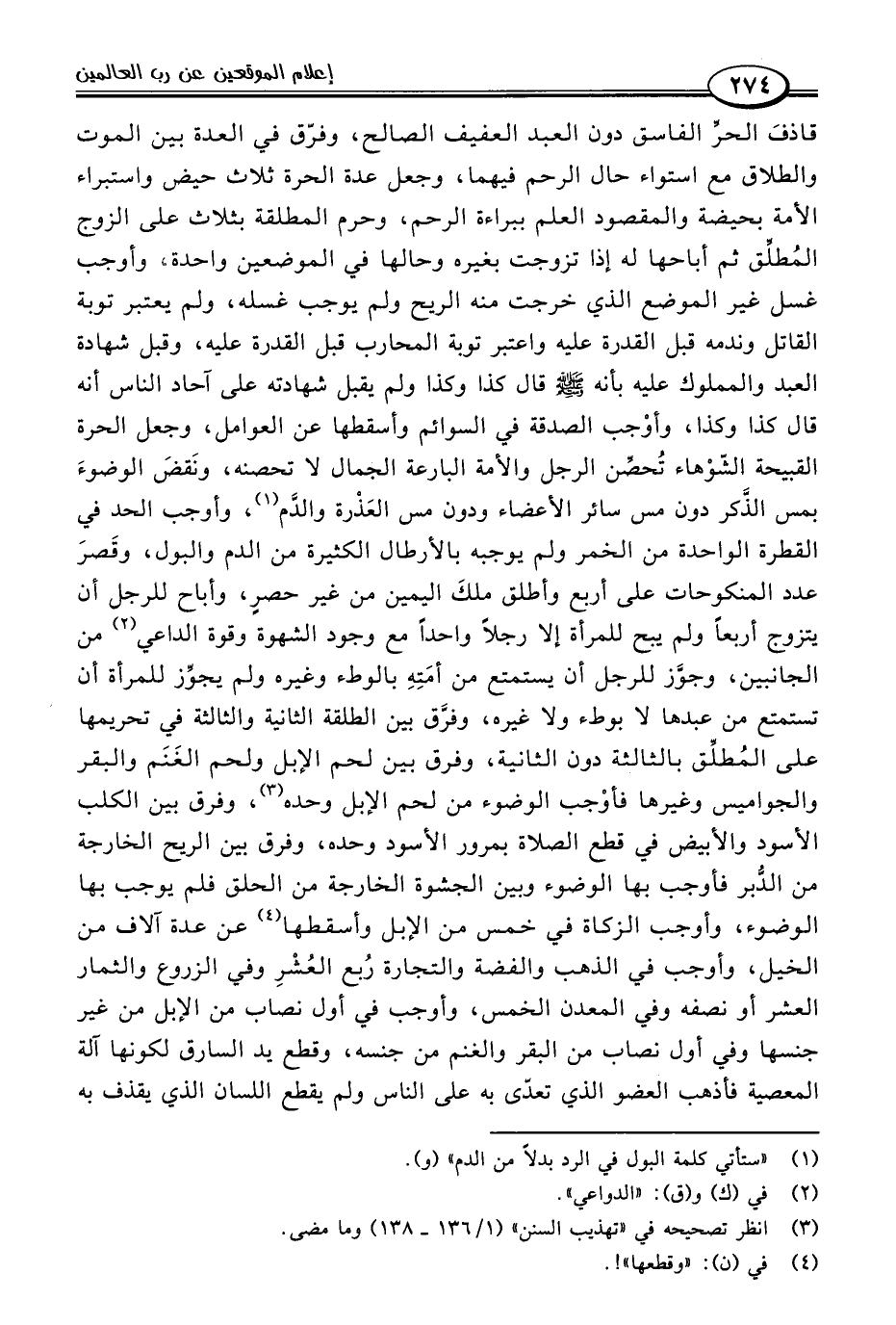 قاذفَ الحرِّ الفاسق دون العبد العفيف الصالح، وفرّق في العدة بين الموت والطلاق مع استواء حال الرحم فيهما، وجعل عدة الحرة ثلاث حيض واستبراء الأمة بحيضة والمقصود العلم ببراءة الرحم، وحرم المطلقة بثلاث على الزوج المُطلِّق ثم أباحها له إذا تزوجت بغيره وحالها في الموضعين واحدة, وأوجب غسل غير الموضع الذي خرجت منه الريح ولم يوجب غسله، ولم يعتبر توبة القاتل وندمه قبل القدرة عليه واعتبر توبة المحارب قبل القدرة عليه، وقبل شهادة العبد والمملوك عليه بأنه -صلى اللَّه عليه وسلم- قال كذا وكذا ولم يقبل شهادته على آحاد الناس أنه قال كذا وكذا، وأوْجب الصدقة في السوائم وأسقطها عن العوامل، وجعل الحرة القبيحة الشّوْهاء تُحصِّن الرجل والأمة البارعة الجمال لا تحصنه، ونَقضَ الوضوءَ بمس الذَّكر دون مس سائر الأعضاء ودون مس العَذْرة والدَّم (١)، وأوجب الحد في القطرة الواحدة من الخمر ولم يوجبه بالأرطال الكثيرة من الدم والبول، وقَصرَ عدد المنكوحات على أربع وأطلق ملكَ اليمين من غير حصرٍ، وأباح للرجل أن يتزوج أربعًا ولم يبح للمرأة إلا رجلًا واحدًا مع وجود الشهوة وقوة الداعي (٢) من الجانبين، وجوَّز للرجل أن يستمتع من أمَتِهِ بالوطء وغيره ولم يجوّز للمرأة أن تستمتع من عبدها لا بوطء ولا غيره، وفرَّق بين الطلقة الثانية والثالثة في تحريمها على المُطلِّق بالثالثة دون الثانية، وفرق بين لحم الإبل ولحم الغَنَم والبقر والجواميس وغيرها فأوْجب الوضوء من لحم الإبل وحده (٣)، وفرق بين الكلب الأسود والأبيض في قطع الصلاة بمرور الأسود وحده، وفرق بين الريح الخارجة من الدُّبر فأوجب بها الوضوء وبين الجشوة الخارجة من الحلق فلم يوجب بها الوضوء، وأوجب الزكاة في خمس من الإبل وأسقطها (٤) عن عدة آلاف من الخيل، وأوجب في الذهب والفضة والتجارة رُبع العُشْرِ وفي الزروع والثمار العشر أو نصفه وفي المعدن الخمس، وأوجب في أول نصاب من الإبل من غير جنسها وفي أول نصاب من البقر والغنم من جنسه، وقطع يد السارق لكونها آلة المعصية فأذهب العضو الذي تعدّى به على الناس ولم يقطع اللسان الذي يقذف به