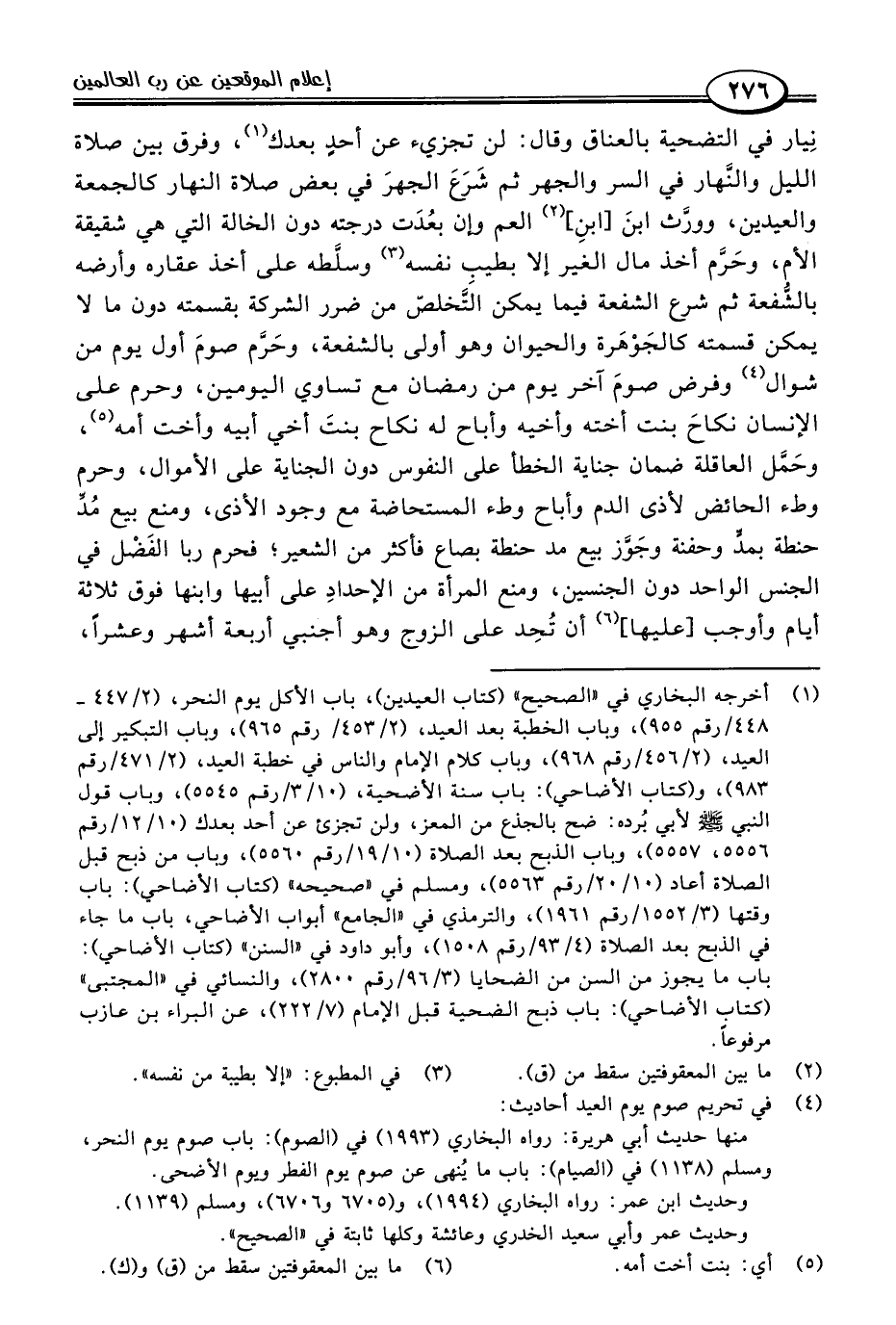 نِيار في التضحية بالعناق وقال: لن تجزيء عن أحدٍ بعدك (١)، وفرق بين صلاة الليل والنَّهار في السر والجهر ثم شَرَعَ الجهرَ في بعض صلاة النهار كالجمعة والعيدين، وورَّث ابنَ [ابنِ] (٢) العم وإن بعُدَت درجته دون الخالة التي هي شقيقة الأم، وحَرَّم أخذ مال الغير إلا بطيب نفسه (٣) وسلَّطه على أخذ عقاره وأرضه بالشُّفعة ثم شرع الشفعة فيما يمكن التَّخلصّ من ضرر الشركة بقسمته دون ما لا يمكن قسمته كالجَوْهَرة والحيوان وهو أولى بالشفعة، وحَرَّم صومَ أول يوم من شوال (٤) وفرض صومَ آخر يوم من رمضان مع تساوي اليومين، وحرم على الإنسان نكاحَ بنت أخته وأخيه وأباح له نكاح بنتَ أخي أبيه وأخت أمه (٥)، وحَمَّل العاقلة ضمان جناية الخطأ على النفوس دون الجناية على الأموال، وحرم وطء الحائض لأذى الدم وأباح وطء المستحاضة مع وجود الأذى، ومنع بيع مُدِّ حنطة بمدٍّ وحفنة وجَوَّز بيع مد حنطة بصاع فأكثر من الشعير؛ فحرم ربا الفَضْل في الجنس الواحد دون الجنسين، ومنع المرأة من الإحدادِ على أبيها وابنها فوق ثلاثة أيام وأوجب [عليها] (٦) أن تُحِد على الزوج وهو أجنبي أربعة أشهر وعشرًا،