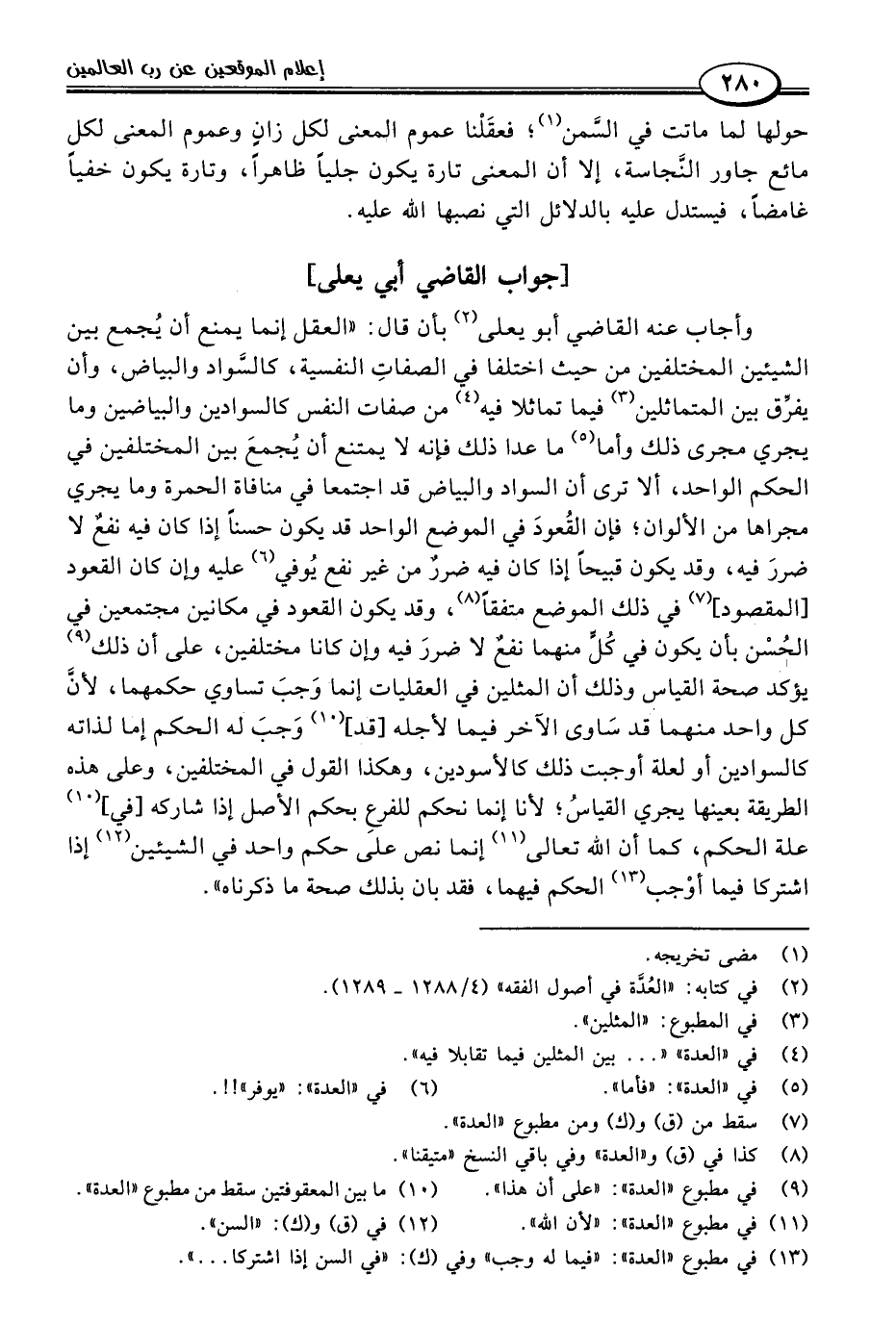 وأجاب عنه القاضي أبو يعلى (٢) بأن قال: "العقل إنما يمنع أن يُجمع بين الشيئين المختلفين من حيث اختلفا في الصفاتِ النفسية، كالسواد والبياض، وأن يفرِّق بين المتماثلين (٣) فيما تماثلا فيه (٤) من صفات النفس كالسوادين والبياضين وما يجري مجرى ذلك وأما (٥) ما عدا ذلك فإنه لا يمتنع أن يُجمعَ بين المختلفين في الحكم الواحد، ألا ترى أن السواد والبياض قد اجتمعا في منافاة العمرة وما يجري مجراها من الألوان؛ فإن القُعودَ في الموضع الواحد قد يكون حسنًا إذا كان فيه نفعٌ لا ضررَ فيه، وقد يكون قبيحًا إذا كان فيه ضررٌ من غير نفع يُوفي (٦) عليه وإن كان القعود [المقصود] (٧) في ذلك الموضع متفقًا (٨)، وقد يكون القعود في مكانين مجتمعين في الحُسْن بأن يكون في كُلٍّ منهما نفعٌ لا ضررَ فيه وإن كانا مختلفين، على أن ذلك (٩) يؤكد صحة القياس وذلك أن المثلين في العقليات إنما وَجبَ تساوي حكمهما؛ لأنَّ كل واحد منهما قد سَاوى الآخر فيما لأجله [قد] (١٠) وَجبَ له الحكم إما لذاته كالسوادين أو لعلة أوجبت ذلك كالأسودين، وهكذا القول في المختلفين، وعلى هذه الطريقة بعينها يجري القياسُ؛ لأنا إنما نحكم للفرعِ بحكم الأصل إذا شاركه [في] (١٠) علة الحكم، كما أن اللَّه تعالى (١١) إنما نص على حكم واحد في الشيئين (١٢) إذا اشتركا فيما أوْجب (١٣) الحكم فيهما، فقد بان بذلك صحة ما ذكرناه".