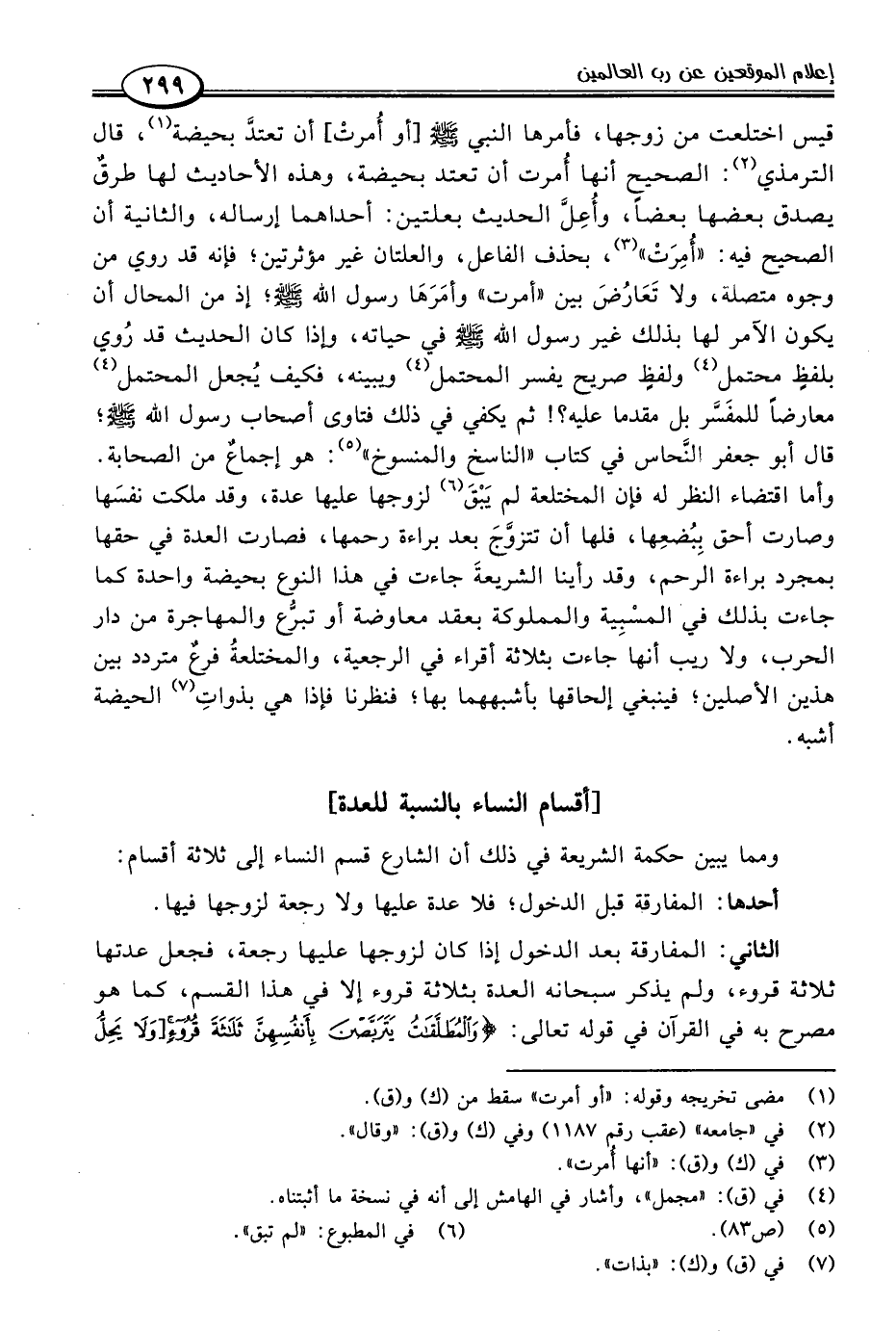 قيس اختلعت من زوجها، فأمرها النبي -صلى اللَّه عليه وسلم-[أو أُمرتْ] أن تعتدَّ بحيضة (١)، قال الترمذي (٢): الصحيح أنها أُمرت أن تعتد بحيضة، وهذه الأحاديث لها طرقٌ يصدق بعضها بعضًا، وأُعِلَّ الحديث بعلتين: أحداهما إرساله، والثانية أن الصحيح فيه: "أُمِرَتْ" (٣)، بحذف الفاعل، والعلتان غير مؤثرتين؛ فإنه قد روي من وجوه متصلة، ولا تَعَارُضَ بين "أمرت" وأمَرَهَا رسول اللَّه -صلى اللَّه عليه وسلم-؛ إذ من المحال أن يكون الآمر لها بذلك غير رسول اللَّه -صلى اللَّه عليه وسلم- في حياته، وإذا كان الحديث قد رُوي بلفظٍ محتمل (٤) ولفظٍ صريح يفسر المحتمل (٤) ويبينه، فكيف يُجعل المحتمل (٤) معارضًا للمفَسَّر بل مقدما عليه؟! ثم يكفي في ذلك فتاوى أصحاب رسول اللَّه -صلى اللَّه عليه وسلم-؛ قال أبو جعفر النَّحاس في كتاب "الناسخ والمنسوخ" (٥): هو إجماعٌ من الصحابة. وأما اقتضاء النظر له فإن المختلعة لم يَبْقَ (٦) لزوجها عليها عدة، وقد ملكت نفسَها وصارت أحق بِبُضعِها، فلها أن تتزوَّجَ بعد براءة رحمها، فصارت العدة في حقها بمجرد براءة الرحم، وقد رأينا الشريعةَ جاءت في هذا النوع بحيضة واحدة كما جاءت بذلك في المسْبِية والمملوكة بعقد معاوضة أو تبرُّع والمهاجرة من دار الحرب، ولا ريب أنها جاءت بثلاثة أقراء في الرجعية، والمختلعةُ فرعٌ متردد بين هذين الأصلين؛ فينبغي إلحاقها بأشبههما بها؛ فنظرنا فإذا هي بذواتِ (٧) الحيضة أشبه.