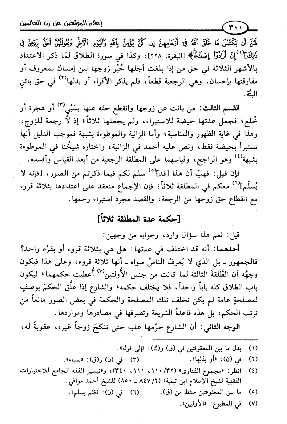 أحدهما: أنه قد اختلف في عدتها: هل هي بثلاثة قروء أو بقرْء واحد؟ فالجمهور -بل الذي لا يَعرفُ الناسُ سواه- أنها ثلاثة قروء، وعلى هذا فيكون وجهُه أن الطَّلقةَ الثالثة لما كانت من جنس الأُولتين (٧) أُعطيت حكمهما؛ ليكون باب الطلاق كله بابًا واحدًا، فلا يختلف حكمه؛ والشارع إذا علَّق الحكمَ بوصفٍ لمصلحةٍ عامة لم يكن تخلف تلك المصلحة والحكمة في بعض الصور مانعًا من ترتب الحكم، بل هذه قاعدةُ الشريعة وتصرفها في مصادرها ومواردها.