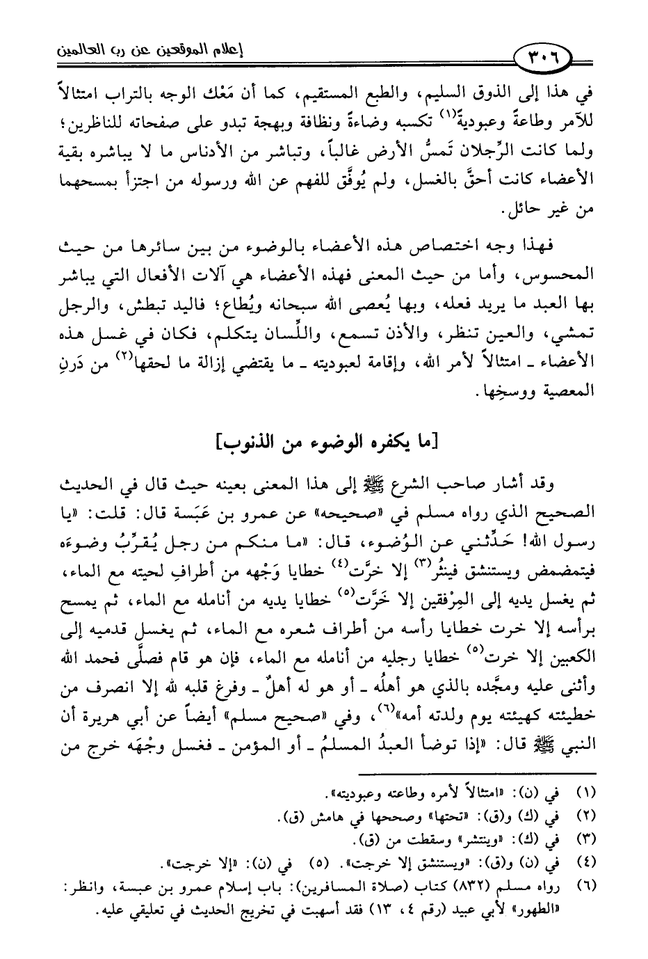وقد أشار صاحب الشرع -صلى اللَّه عليه وسلم- إلى هذا المعنى بعينه حيث قال في الحديث الصحيح الذي رواه مسلم في "صحيحه" عن عمرو بن عَبَسة قال: قلت: "يا رسول اللَّه! حَدثني عن الوُضوء، قال: "ما منكم من رجل يُقرِّبُ وضوءَه فيتمضمض ويستنشق فينثُر (٣) إلا خرَّت (٤) خطايا وَجْهه من أطرافِ لحيته مع الماء، ثم يغسل يديه إلى المِرْفقين إلا خَرَّت (٥) خطايا يديه من أنامله مع الماء، ثم يمسح برأسه إلا خرت خطايا رأسه من أطراف شعره مع الماء، ثم يغسل قدميه إلى الكعبين إلا خرت (٥) خطايا رجليه من أنامله مع الماء، فإن هو قام فصلَّى فحمد اللَّه وأثنى عليه ومجَّده بالذي هو أهلُه -أو هو له أهلٌ- وفرغ قلبه للَّه إلا انصرف من خطيئته كهيئته يوم ولدته أمه" (٦)، وفي "صحيح مسلم" أيضًا عن أبي هريرة أن النبي -صلى اللَّه عليه وسلم- قال: "إذا توضأ العبدُ المسلمُ -أو المؤمن- فغسل وجْهَه خرج من