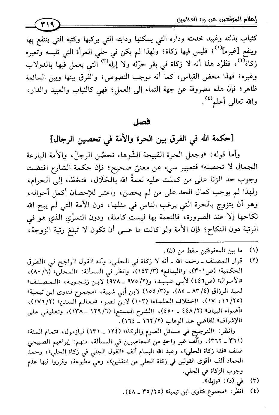 وأما قوله: "وجعل الحرة القبيحة الشوهاء تحصِّن الرجلَ، والأمة البارعة الجمال لا تحصنه" فتعبير سيء عن معنًى صحيح؛ فإن حكمة الشارع اقتضت وجوب حد الزنا على من كملت عليه نعمةُ اللَّه بالحَلَال، فتخطّاه إلى الحرام، ولهذا لم يوجب كمال الحد على من لم يحصن، واعتبر للإحصان أكمل أحواله، وهو أن يتزوج بالحرة التي يرغب الناس في مثلها، دون الأمة التي لم يبح اللَّه نكاحها إلا عند الضرورة، فالنعمة بها ليست كاملة، ودون التسرِّي الذي هو في الرتبة دون النكاح؛ فإن الأمة ولو كانت ما عسى أن تكون لا تبلغ رتبة الزوجة،