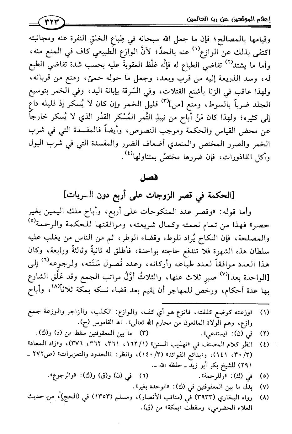 فصل [الحكمة في قصر الزوجات على أربع دون السريات]