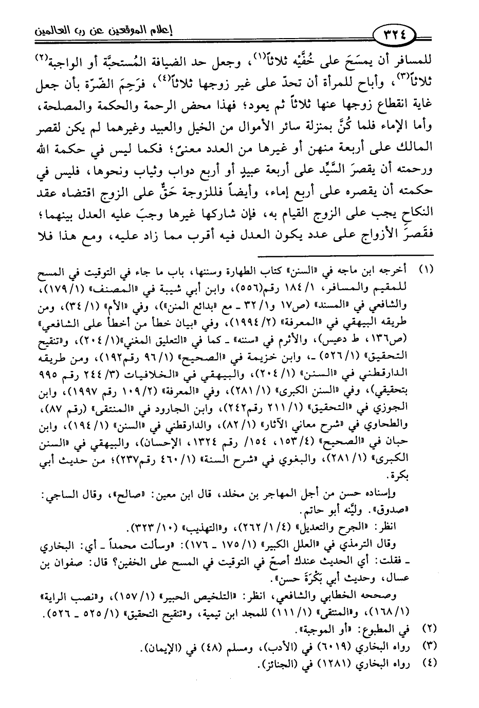للمسافر أن يمسَحَ على خُفَيْه ثلاثًا (١)، وجعل حد الضيافة المُستحبَّة أو الواجبة (٢) ثلاثًا (٣)، وأباح للمرأة أن تحدّ على غير زوجها ثلاثًا (٤)، فرَحِمَ الضّرّة بأن جعل غاية انقطاع زوجها عنها ثلاثًا ثم يعود؛ فهذا محض الرحمة والحكمة والمصلحة، وأما الإماء فلما كُنَّ بمنزلة سائر الأموال من الخيل والعبيد وغيرهما لم يكن لقصر المالك على أربعة منهن أو غيرها من العدد معنًى؛ فكما ليس في حكمة اللَّه ورحمته أن يقصرَ السَّيِّد على أربعة عبيدٍ أو أربع دواب وثياب ونحوها، فليس في حكمته أن يقصره على أربع إماء، وأيضًا فللزوجة حَقٌّ على الزوج اقتضاه عقد النكاحِ يجب على الزوج القيام به، فإن شاركها غيرها وجبَ عليه العدل بينهما؛ فقَصرَ الأزواج على عدد يكون العدل فيه أقرب مما زاد عليه، ومع هذا فلا