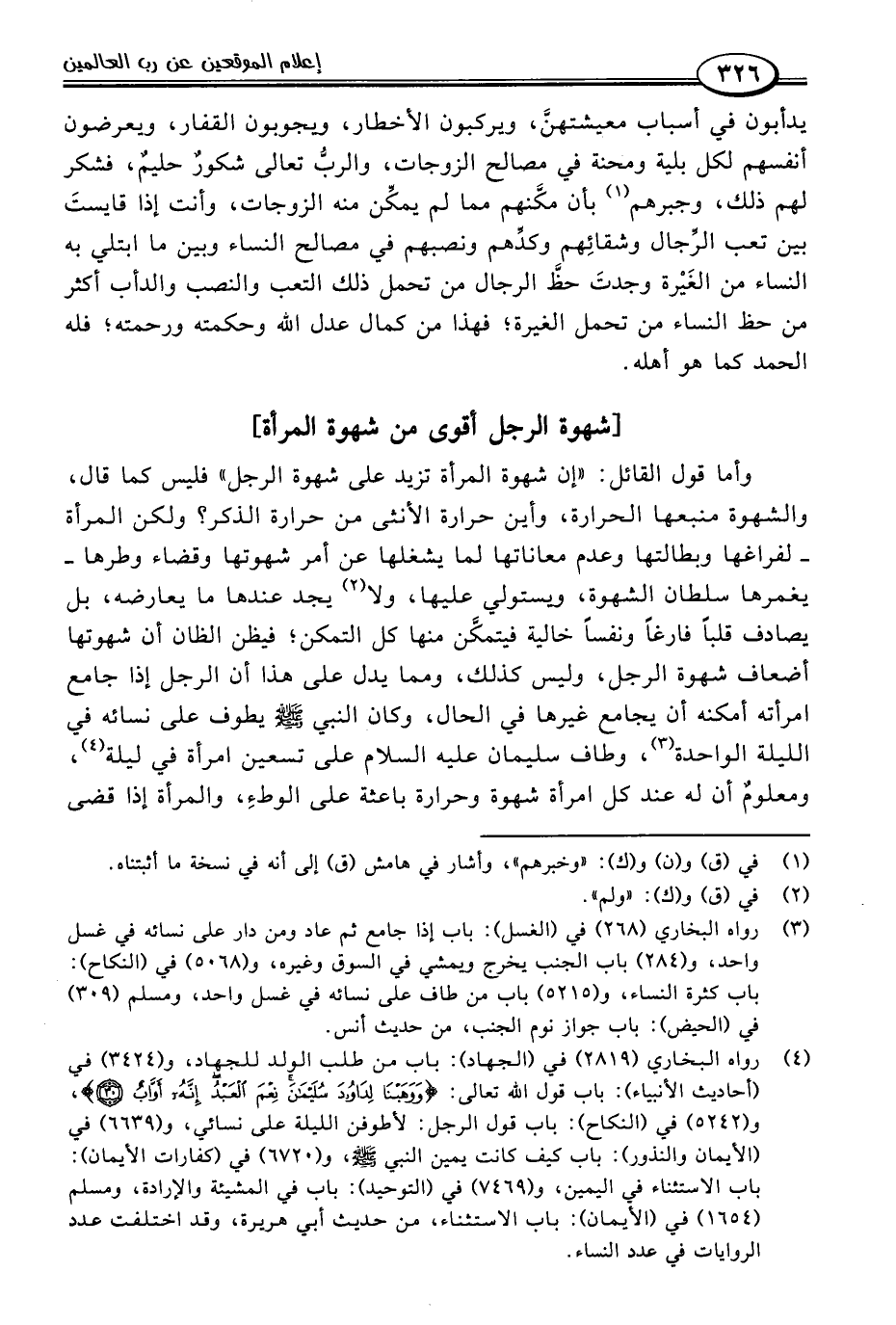 وأما قول القائل: "إن شهوة المرأة تزيد على شهوة الرجل "فليس كما قال، والشهوة منبعها الحرارة، وأين حرارة الأنثى من حرارة الذكر؟ ولكن المرأة -لفراغها وبطالتها وعدم معاناته لما يشغلها عن أمر شهوتها وقضاء وطرها- يغمرها سلطان الشهوة، ويستولي عليها، ولا (٢) يجد عندها ما يعارضه، بل يصادف قلبًا فارغًا ونفسًا خالية فيتمكَّن منها كل التمكن؛ فيظن الظان أن شهوتها أضعاف شهوة الرجل، وليس كذلك، ومما يدل على هذا أن الرجل إذا جامع امرأته أمكنه أن يجامع غيرها في الحال، وكان النبي -صلى اللَّه عليه وسلم- يطوف على نسائه في الليلة الواحدة (٣)، وطاف سليمان عليه السلام على تسعين امرأة في ليلة (٤)، ومعلومٌ أن له عند كل امرأة شهوة وحرارة باعثة على الوطءِ، والمرأة إذا قضى