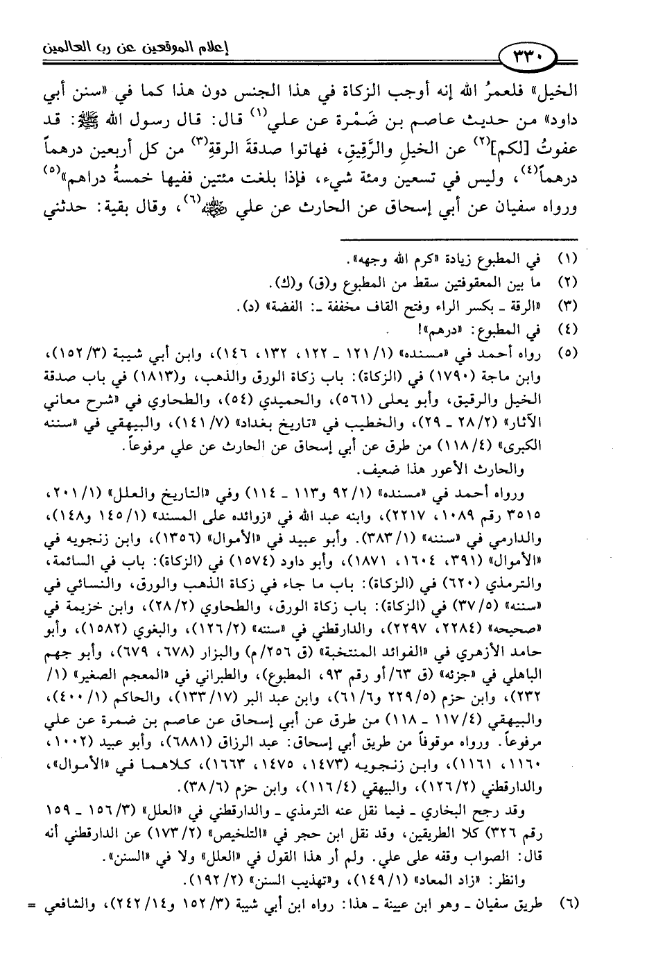 (٥) رواه أحمد في "مسنده" (١/ ١٢١ - ١٢٢، ١٣٢، ١٤٦)، وابن أبي شيبة (٣/ ١٥٢)، وابن ماجة (١٧٩٠) في (الزكاة): باب زكاة الورق والذهب، و (١٨١٣) في باب صدقة الخيل والرقيق، وأبو يعلى (٥٦١)، والحميدي (٥٤)، والطحاوي في "شرح معاني الآثار" (٢/ ٢٨ - ٢٩)، والخطيب في "تاريخ بغداد" (٧/ ١٤١)، والبيهقي في "سننه الكبرى" (٤/ ١١٨) من طرق عن أبي إسحاق عن الحارث عن علي مرفوعًا.