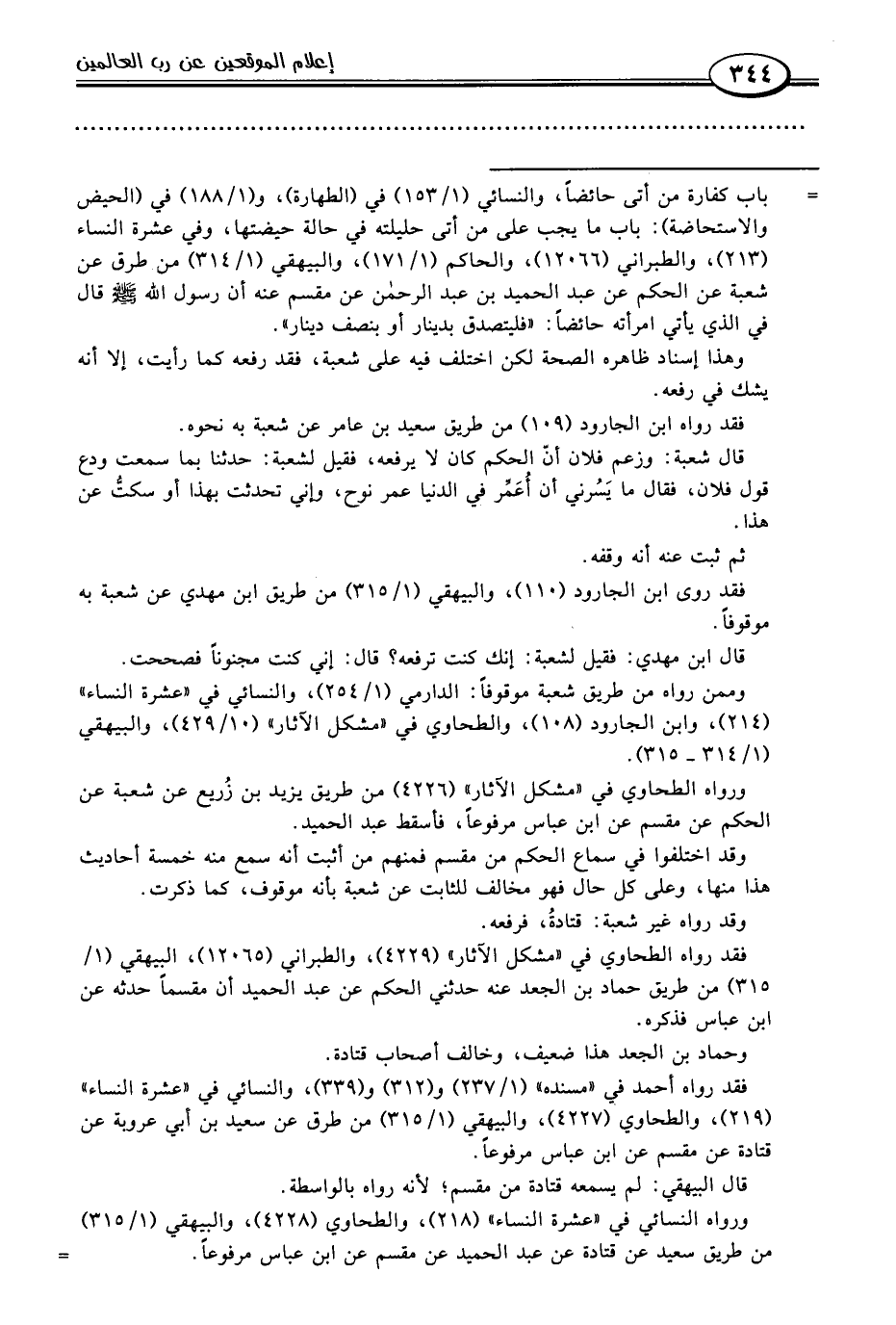 = باب كفارة من أتى حائضًا، والنسائي (١/ ١٥٣) في (الطهارة)، و (١/ ١٨٨) في (الحيض والاستحاضة): باب ما يجب على من أتى حليلته في حالة حيضتها، وفي عشرة النساء (٢١٣)، والطبراني (١٢٠٦٦)، والحاكم (١/ ١٧١)، والبيهقي (١/ ٣١٤) من طرق عن شعبة عن الحكم عن عبد الحميد بن عبد الرحمن عن مقسم عنه أن رسول اللَّه -صلى اللَّه عليه وسلم- قال في الذي يأتي امرأته حائضًا: "فليتصدق بدينار أو بنصف دينار".