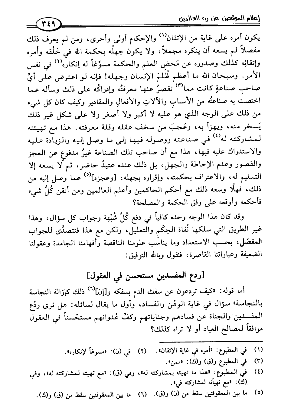 وقد كان هذا الوجه وحده كافيًا في دفع كُلِّ شُبْهة وجواب كل سؤال، وهذا غير الطريق التي سلكها نُفاة الحِكَمِ والتعليل، ولكن مع هذا فنتصدَّى للجواب المفصّل، بحسب الاستعداد وما يناسب علومنا الناقصة وأفهامنا الجامدة وعقولنا الضعيفة وعباراتنا القاصرة، فنقول وباللَّه التوفيق: