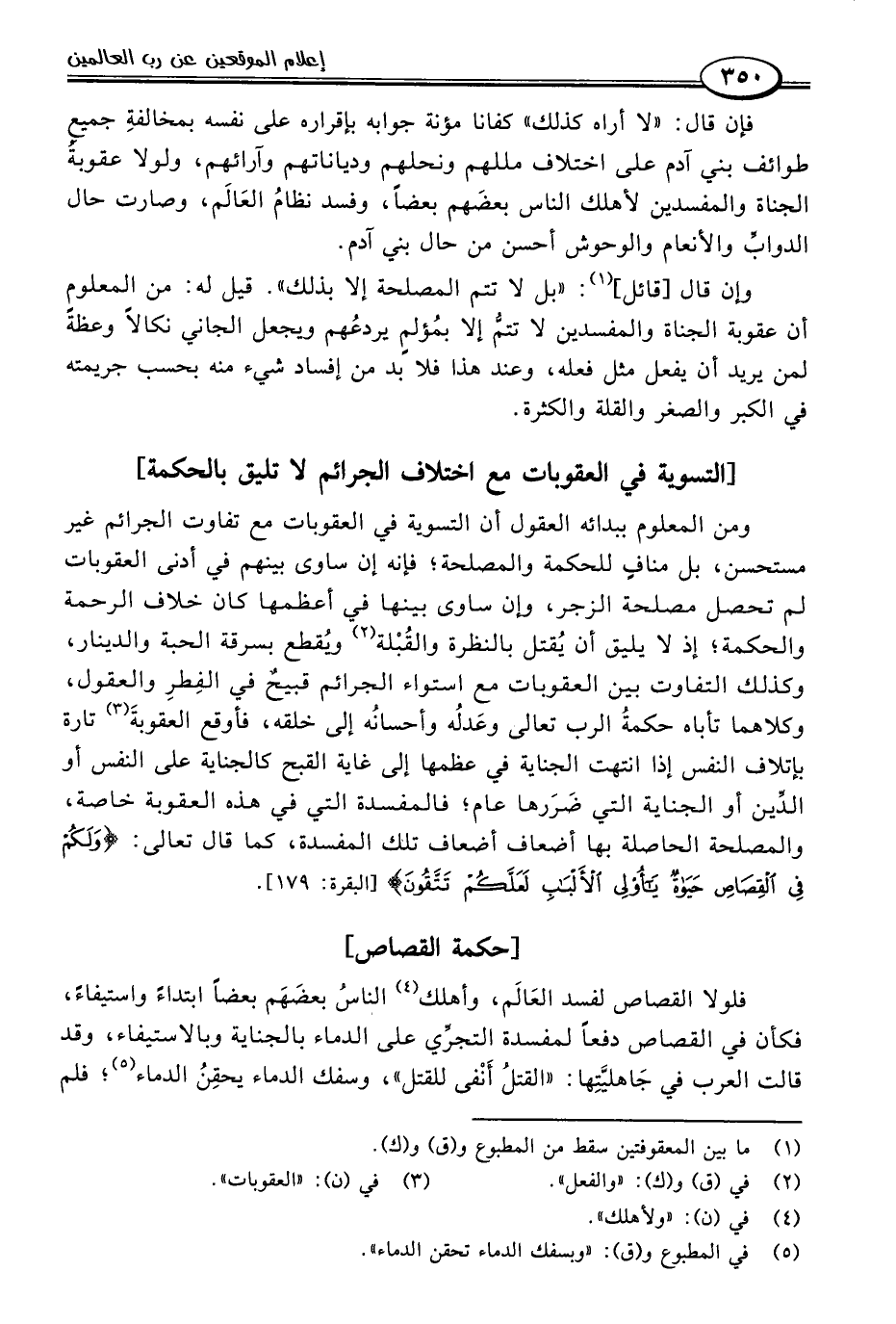 ومن المعلوم ببدائه العقول أن التسوية في العقوبات مع تفاوت الجرائم غير مستحسن، بل منافٍ للحكمة والمصلحة؛ فإنه إن ساوى بينهم في أدنى العقوبات لم تحصل مصلحة الزجر، وإن ساوى بينها في أعظمها كان خلاف الرحمة والحكمة؛ إذ لا يليق أن يُقتل بالنظرة والقُبْلة (٢) ويُقطع بسرقة الحبة والدينار، وكذلك التفاوت بين العقوبات مع استواء الجرائم قبيحٌ في الفِطرِ والعقول، وكلاهما تأباه حكمةُ الرب تعالى وعَدلُه وأحسانُه إلى خلقه، فأوقع العقوبةَ (٣) تارة بإتلاف النفس إذا انتهت الجناية في عظمها إلى غاية القبح كالجناية على النفس أو الدِّين أو الجناية التي ضَرَرها عام؛ فالمفسدة التي في هذه العقوبة خاصة، والمصلحة الحاصلة بها أضعاف أضعاف تلك المفسدة، كما قال تعالى: {وَلَكُمْ فِي الْقِصَاصِ حَيَاةٌ يَاأُولِي الْأَلْبَابِ لَعَلَّكُمْ تَتَّقُونَ} [البقرة: ١٧٩].