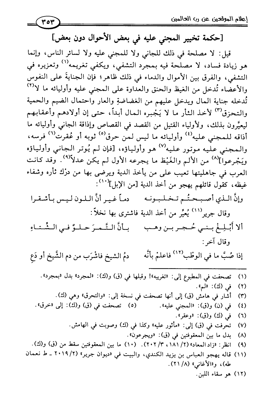 قيل: لا مصلحة في ذلك للجاني ولا للمجني عليه ولا لسائر الناس، وإنما هو زيادة فساد، لا مصلحة فيه بمجرد التشفي، ويكفي تغريمه (١) وتعزيره في التشفي، والفرق بين الأموال والدماء في ذلك ظاهر؛ فإن الجنايةَ على النفوس والأعضاء تُدخل من الغيظ والحنق والعداوة على المجني عليه وأوليائه ما لا (٢) تُدخله جناية المال ويدخل عليهم من الغضاضةِ والعار واحتمال الضيم والحمية والتحزق (٣) لأخذ الثأر ما لا يَجْبره المال أبدًا، حتى إن أولادهم وأعقابهم ليعيَّرون بذلك، ولأولياء القتيل من القصد في القصاص وإذاقة الجاني وأوليائه ما أذاقه للمجني عليه (٤) وأوليائه ما ليس لمن حرق (٥) ثوبه أو عُقرت (٦) فرسه، والمجني عليه موتور عليه (٧) هو وأولياؤه، [فإن لم يُوتر الجاني وأولياؤه ويَجْرعوا] (٨) من الألم والغَيْظ ما يجرعه الأول لم يكن عدلًا (٩). وقد كانت العرب في جاهليتها تعيب على من يأخذ الدية ويرضى بها من درْك ثأره وشفاء غيظه، كقول قائلهم يهجو من أخذ الدية [من الإبل] (١٠):