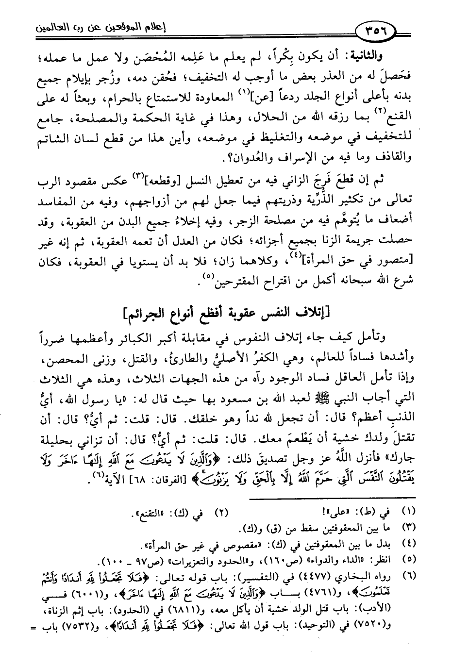 وتأمل كيف جاء إتلاف النفوس في مقابلة أكبر الكبائر وأعظمها ضررًا وأشدها فسادًا للعالم، وهي الكفرُ الأصلي والطارئُ، والقتل، وزنى المحصن، وإذا تأمل العاقل فساد الوجود رآه من هذه الجهات الثلاث، وهذه هي الثلاث التي أجاب النبي -صلى اللَّه عليه وسلم- لعبد اللَّه بن مسعود بها حيث قال له: "يا رسول اللَّه، أي الذنبِ أعظم؟ قال: أن تجعل للَّه ندًا وهو خلقك. قال: قلت: ثم أيُّ؟ قال: أن تقتلَ ولدك خشية أن يَطْعمَ معك. قال: قلت: ثم أيُّ؟ قال: أن تزاني بحليلة جارك" فأنزل اللَّه -عز وجل- تصديقَ ذلك: {وَالَّذِينَ لَا يَدْعُونَ مَعَ اللَّهِ إِلَهًا آخَرَ وَلَا يَقْتُلُونَ النَّفْسَ الَّتِي حَرَّمَ اللَّهُ إِلَّا بِالْحَقِّ وَلَا يَزْنُونَ} [الفرقان: ٦٨] الآية (٦).