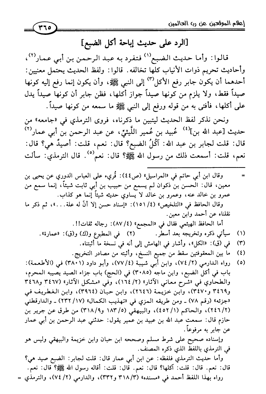 (٥) رواه الدارمي (٢/ ٧٤)، وابن أبي شيبة (٤/ ٧٧)، وأبو داود (٣٨٠١) في (الأطعمة): باب في أكل الضبع، وابن ماجه (٣٠٨٥) في (الحج) باب جزاء الصيد يصيبه المحرم، والطحاوي في "شرح معاني الآثار" (٢/ ١٦٤)، وفي "مشكل الآثار" (٣٤٦٧ و ٣٤٦٨ و ٣٤٦٩ و ٣٤٧٠)، وابن خزيمة (٢٦٤٦)، وابن حبان (٣٩٦٤)، وابن الغطريف في "جزئه" (رقم ٧٨) -ومن طريقه المزي في "تهذيب الكمال" (١٧/ ٢٣٢) - والدارقطني (٢/ ٢٤٦)، والحاكم (١/ ٤٥٢)، والبيهقي (٥/ ١٨٣ و ٩/ ٣١٨) من طرق عن جرير بن حازم قال: سمعت عبد اللَّه بن عبيد بن عمير يقول: حدثني عبد الرحمن بن أبي عمار عن جابر به مرفوعًا.