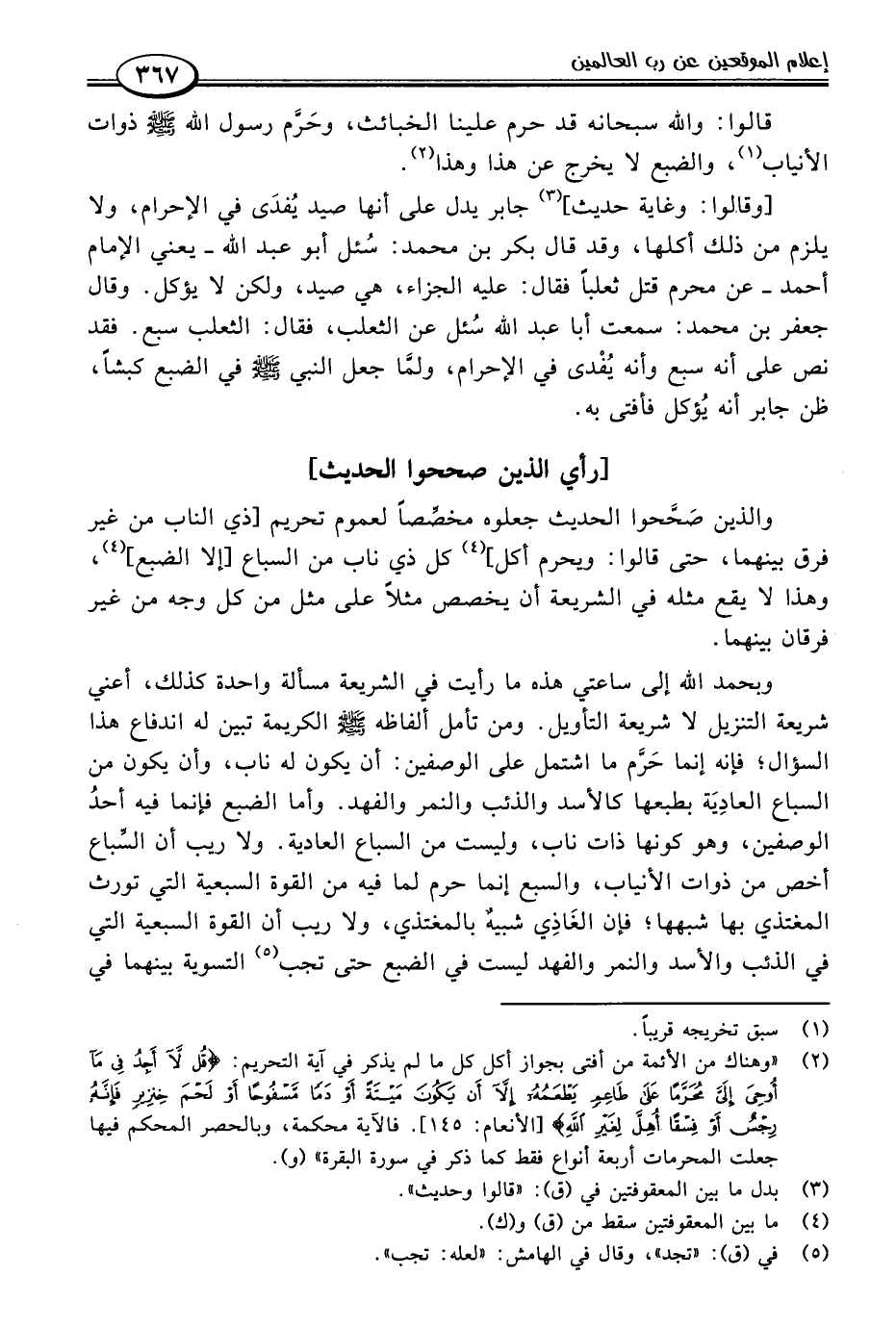 وبحمد اللَّه إلى ساعتي هذه ما رأيت في الشريعة مسألة واحدة كذلك، أعني شريعة التنزيل لا شريعة التأويل. ومن تأمل ألفاظه -صلى اللَّه عليه وسلم- الكريمة تبين له اندفاع هذا السؤال؛ فإنه إنما حَرَّم ما اشتمل على الوصفين: أن يكون له ناب، وأن يكون من السباع العادِيَة بطبعها كالأسد والذئب والنمر والفهد. وأما الضبع فإنما فيه أحدُ الوصفين، وهو كونها ذات ناب، وليست من السباع العادية. ولا ريب أن السِّباع أخص من ذوات الأنياب، والسبع إنما حرم لما فيه من القوة السبعية التي تورث المغتذي بها شبهها؛ فإن الغَاذِي شبيهٌ بالمغتذي، ولا ريب أن القوة السبعية التي في الذئب والأسد والنمر والفهد ليست في الضبع حتى تجب (٥) التسوية بينهما في