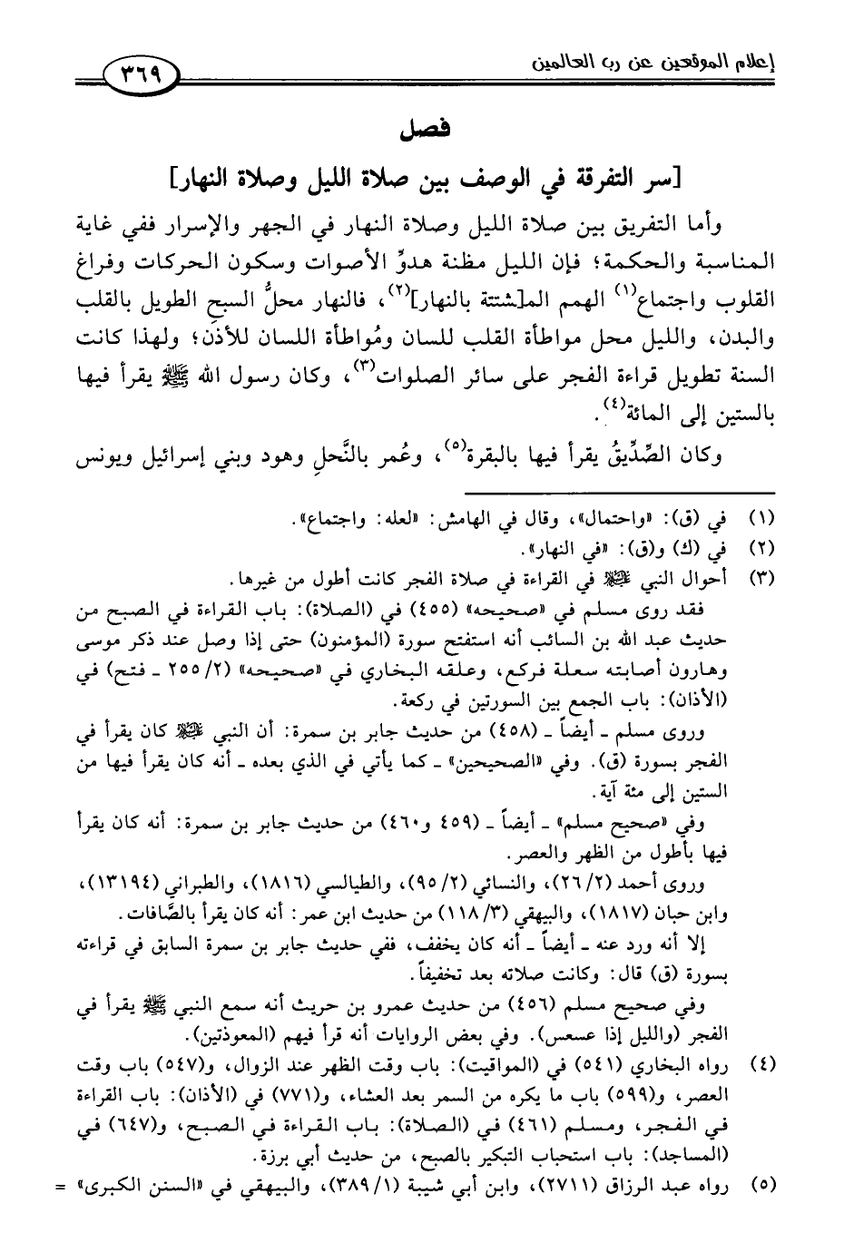 وأما التفريق بين صلاة الليل وصلاة النهار في الجهر والإسرار ففي غاية المناسبة والحكمة؛ فإن الليل مظنة هدوِّ الأصوات وسكون الحركات وفراغ القلوب واجتماع (١) الهمم المـ[ـشتتة بالنهار] (٢)، فالنهار محل السبح الطويل بالقلب والبدن، والليل محل مواطأة القلب للسان ومُواطأة اللسان للأذن؛ ولهذا كانت السنة تطويل قراءة الفجر على سائر الصلوات (٣)، وكان رسول اللَّه -صلى اللَّه عليه وسلم- يقرأ فيها بالستين إلى المائة (٤).