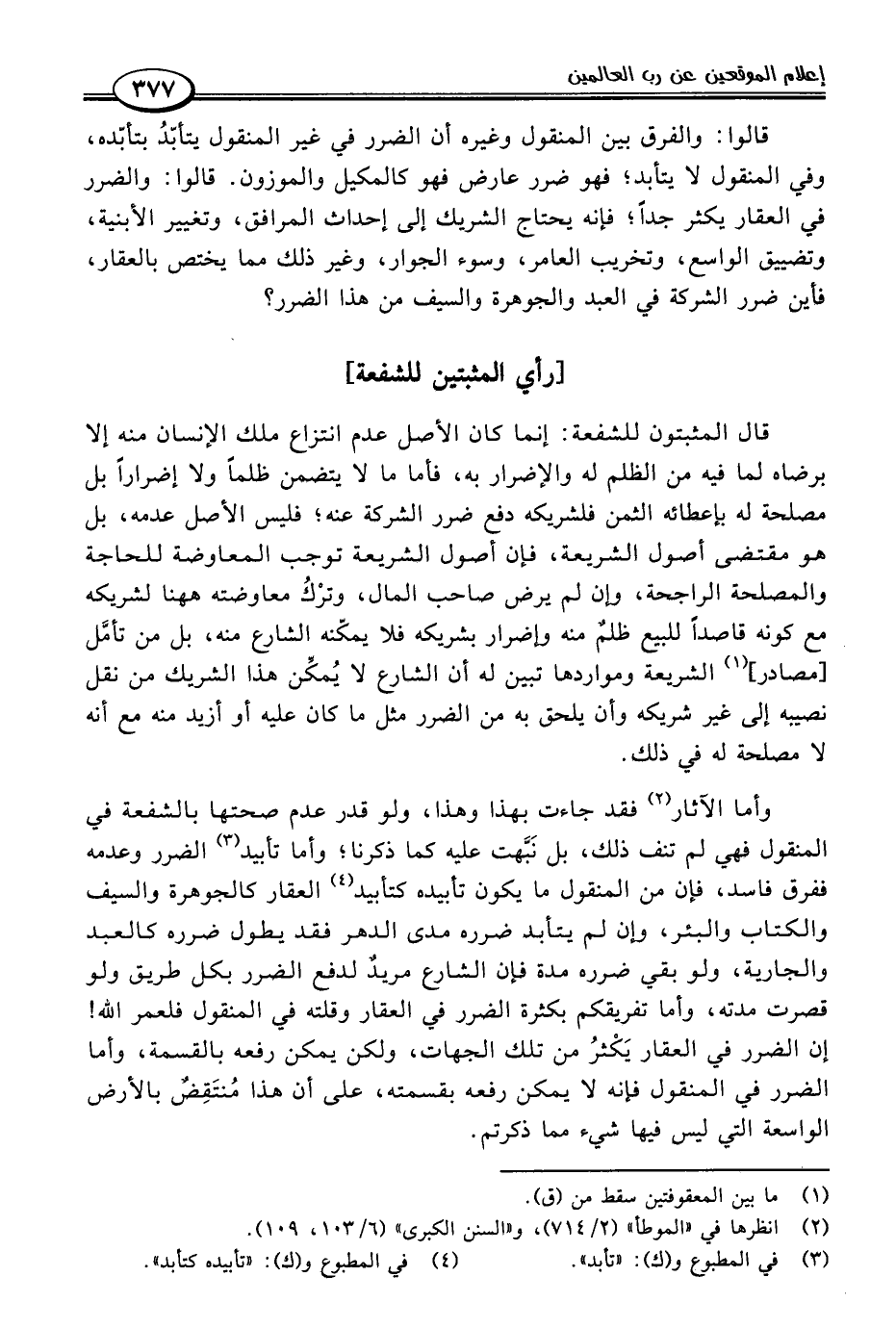 وأما الآثار (٢) فقد جاءت بهذا وهذا، ولو قدر عدم صحتها بالشفعة في المنقول فهي لم تنف ذلك، بل نَبهت عليه كما ذكرنا؛ وأما تأبيد (٣) الضرر وعدمه ففرق فاسد، فإن من المنقول ما يكون تأبيده كتأبيد (٤) العقار كالجوهرة والسيف والكتاب والبئر، وإن لم يتأبد ضرره مدى الدهر فقد يطول ضرره كالعبد والجارية، ولو بقي ضرره مدة فإن الشارع مريدٌ لدفع الضرر بكل طريق ولو قصرت مدته، وأما تفريقكم بكثرة الضرر في العقار وقلته في المنقول فلعمر اللَّه! إن الضرر في العقار يَكْثرُ من تلك الجهات، ولكن يمكن رفعه بالقسمة، وأما الضرر في المنقول فإنه لا يمكن رفعه بقسمته، على أن هذا مُنتَقِضٌ بالأرض الواسعة التي ليس فيها شيء مما ذكرتم.