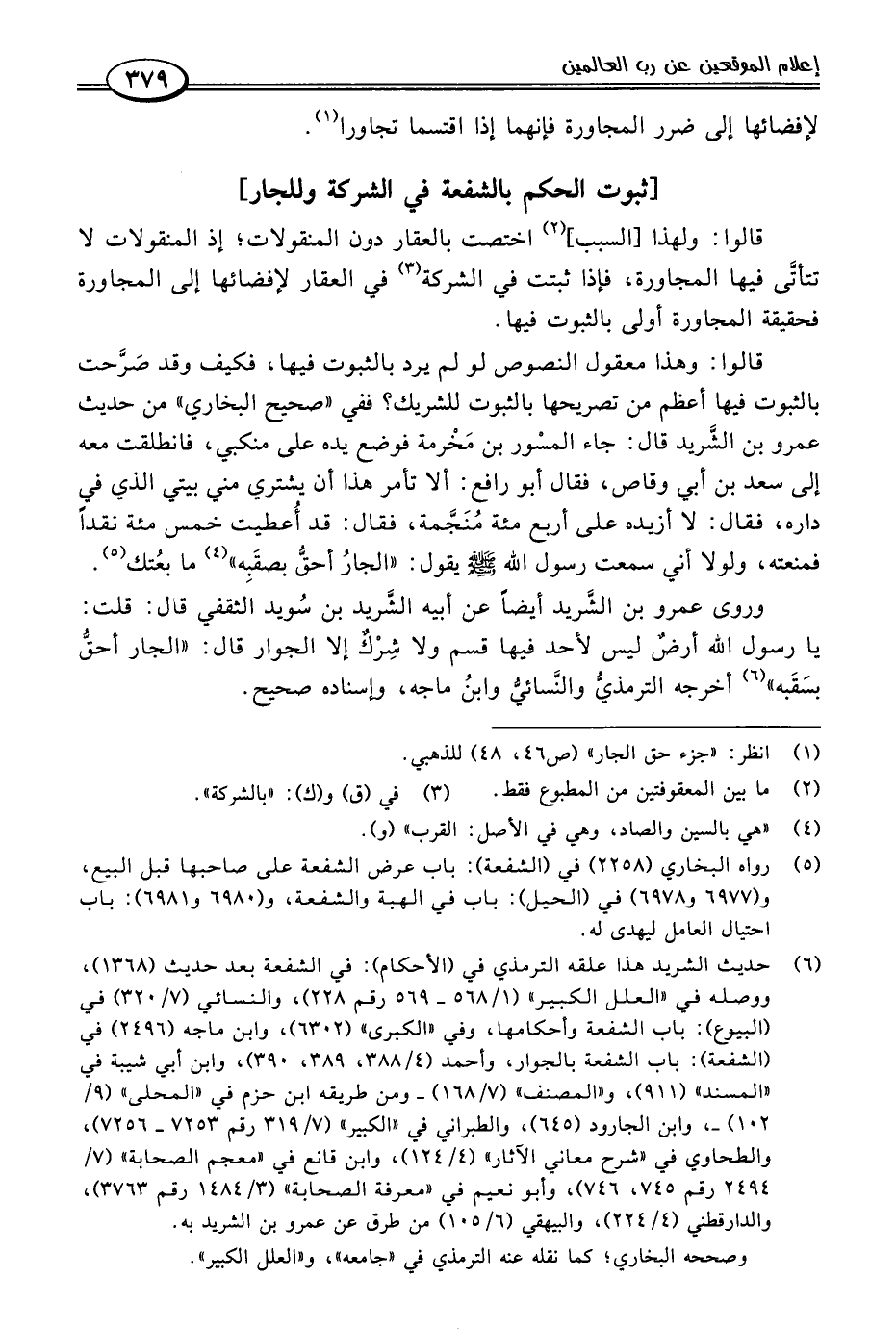 (٥) رواه البخاري (٢٢٥٨) في (الشفعة): باب عرض الشفعة على صاحبها قبل البيع، و (٦٩٧٧ و ٦٩٧٨) في (الحيل): باب في الهبة والشفعة، و (٦٩٨٠ و ٦٩٨١): باب احتيال العامل ليهدى له.