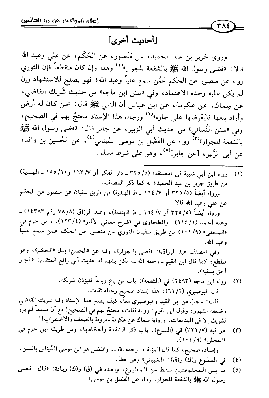 وروى جَرير بن عبد الحميد، عن مَنْصور، عن الحَكَم، عن علي وعبد اللَّه قالا: "قضى رسول اللَّه -صلى اللَّه عليه وسلم- بالشفعة للجوار" (١) وهذا وإن كان منقطعًا فإن الثوري رواه عن منصور عن الحكم عَمَّن سمع عليًا وعبد اللَّه؛ فهو يصلح للاستشهاد وإن لم يكن عليه وحده الاعتماد، وفي "سنن ابن ماجه" من حديث شَريك القاضي، عن سِماك، عن عكرمة، عن ابن عباس أن النبي -صلى اللَّه عليه وسلم- قال: "من كان له أرض وأراد بيعها فليَعْرضها على جاره" (٢) ورجال هذا الإسناد محتجٌ بهم في الصحيح، وفي "سنن النسائي" من حديث أبي الزبير، عن جابر قال: "قضى رسول اللَّه -صلى اللَّه عليه وسلم- بالشفعة للجوار" (٣) رواه عن الفَضْل بن موسى السِّيناني (٤)، عن الحُسين بن واقد، عن أبي الزبير، [عن جابر] (٥)، وهو على شرط مسلم.